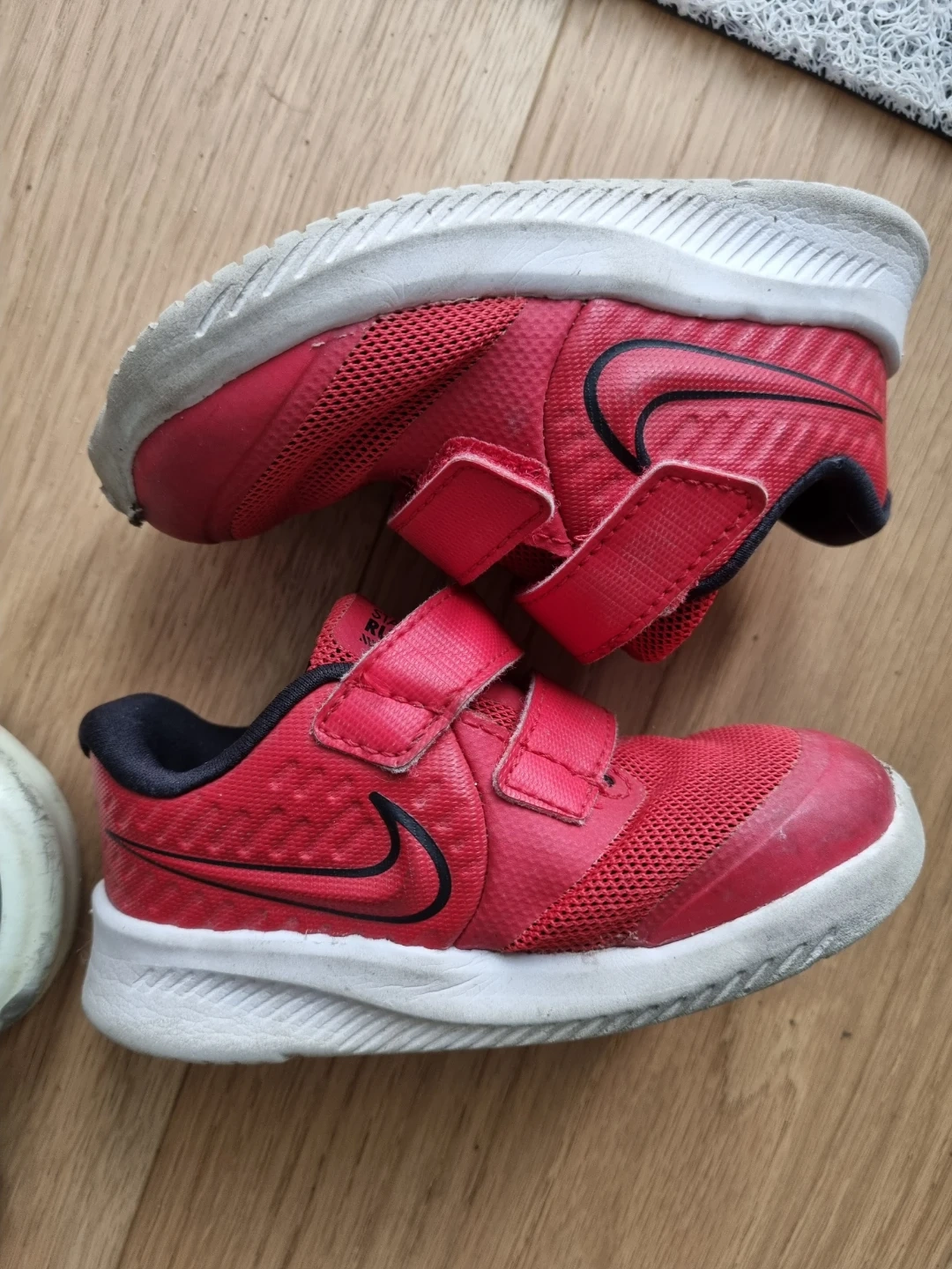 These are red Nike Star Runner shoes for kids. They feature a breathable mesh upper and adjustable hook-and-loop straps for an easy fit. The rubber sole offers good traction. Size is 6.