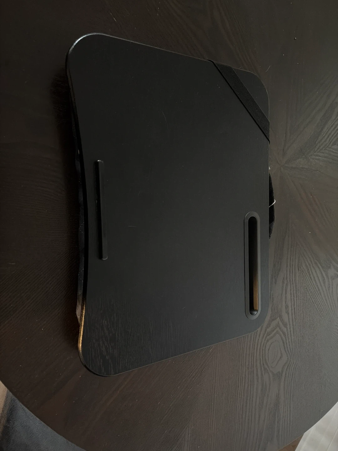 Black lap desk with an elastic strap to secure devices. It has a built-in handle and a slot for a pen or stylus. The surface is smooth and provides a stable workspace.