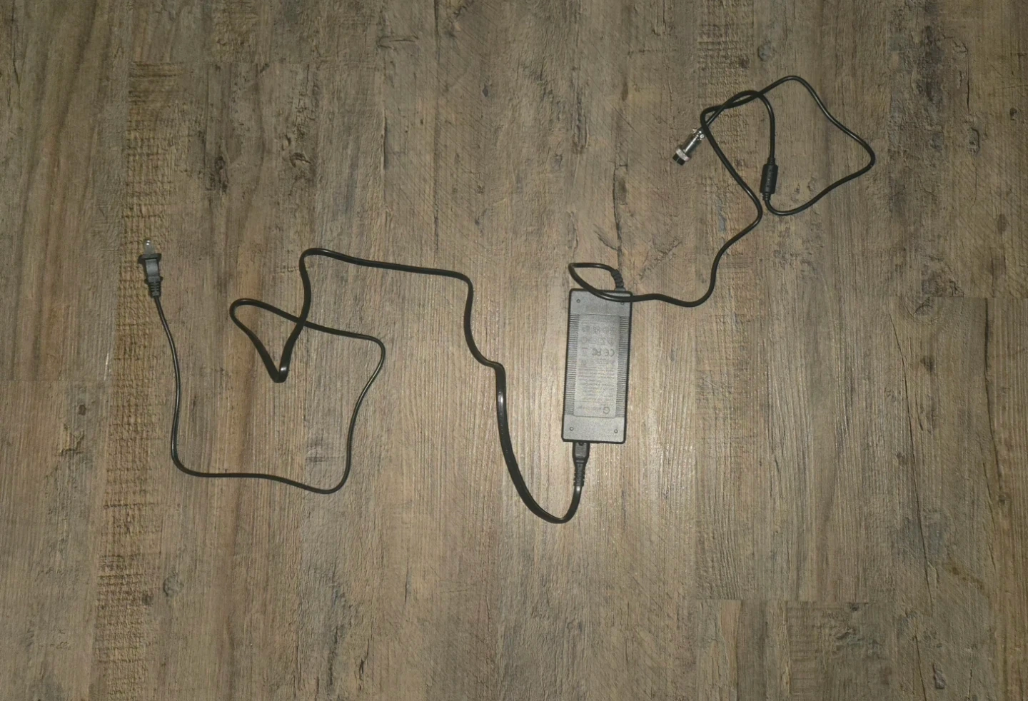 Plug City E-Scooter charger. Around 8 feet long. Plugs into any wall outlet and screws onto the charging port on the E-Scooter to secure charging.