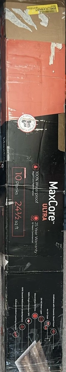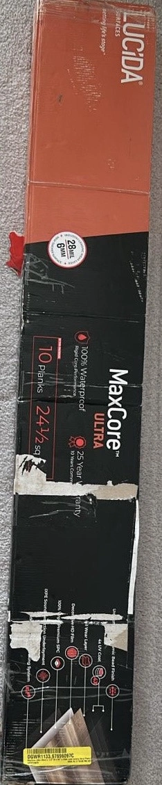 Offering a new box of Lucida Maxcore Ultra flooring, perfect for upgrading your space with a durable and waterproof solution. Each box contains 10 planks covering 24.77 square feet. Selling for $65. Coverage: 24.77 sq ft per box. Planks: 10 per box. Waterproof: Yes. If this ad is still up, it's still available!