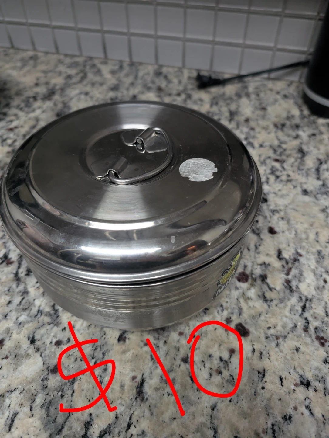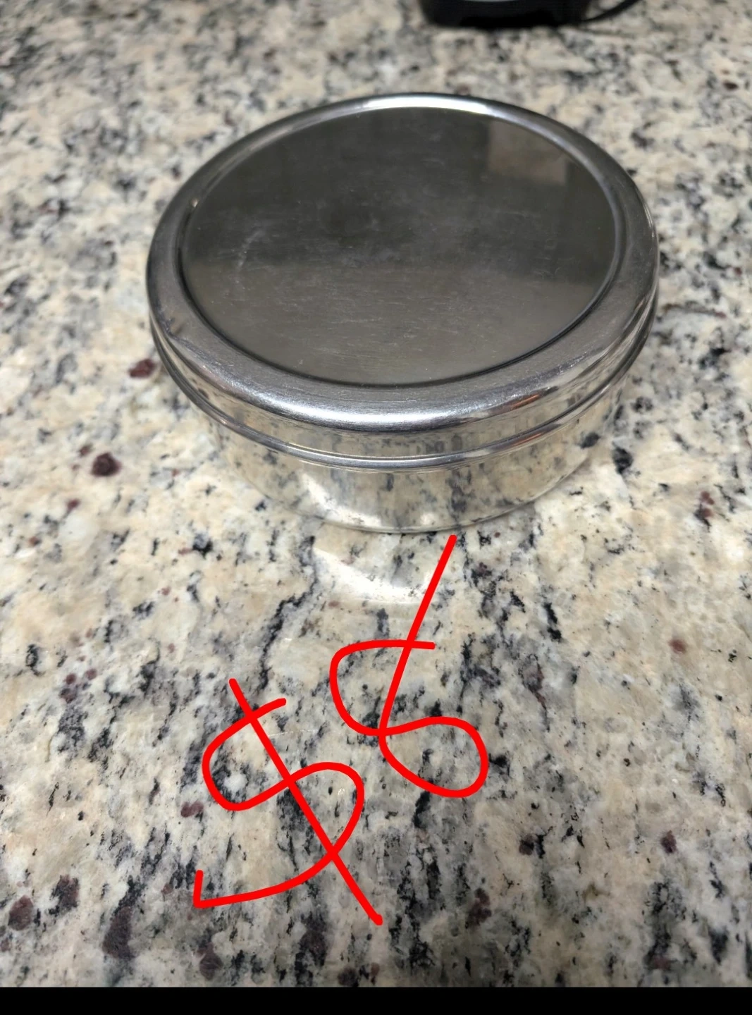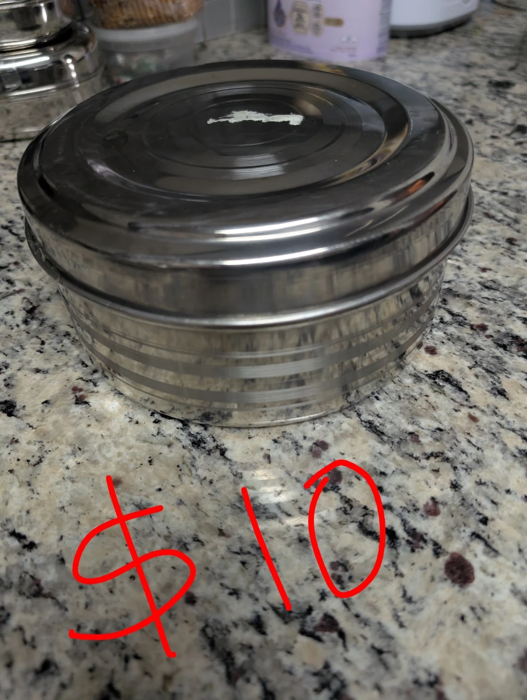This is a stainless steel round container. It's good for storing leftovers or dry goods. It's durable and easy to clean!