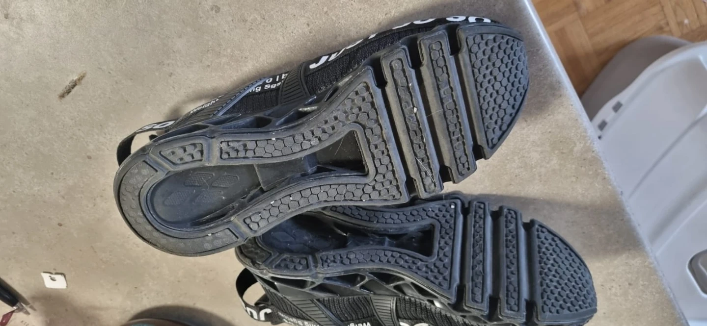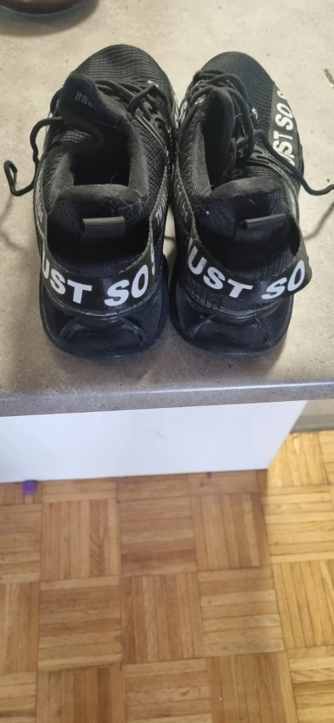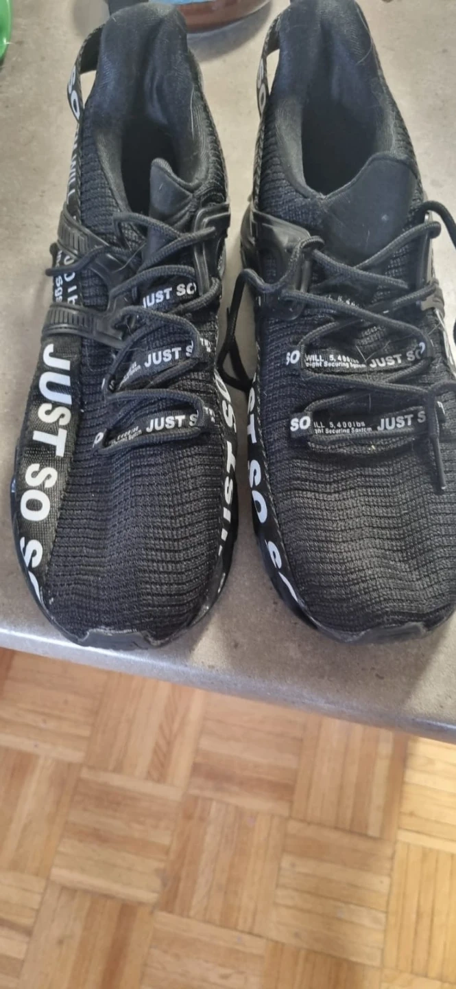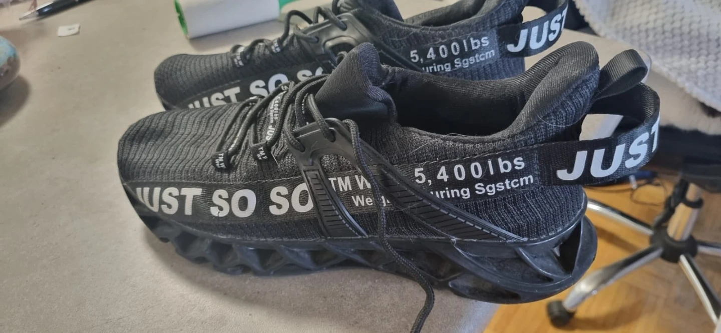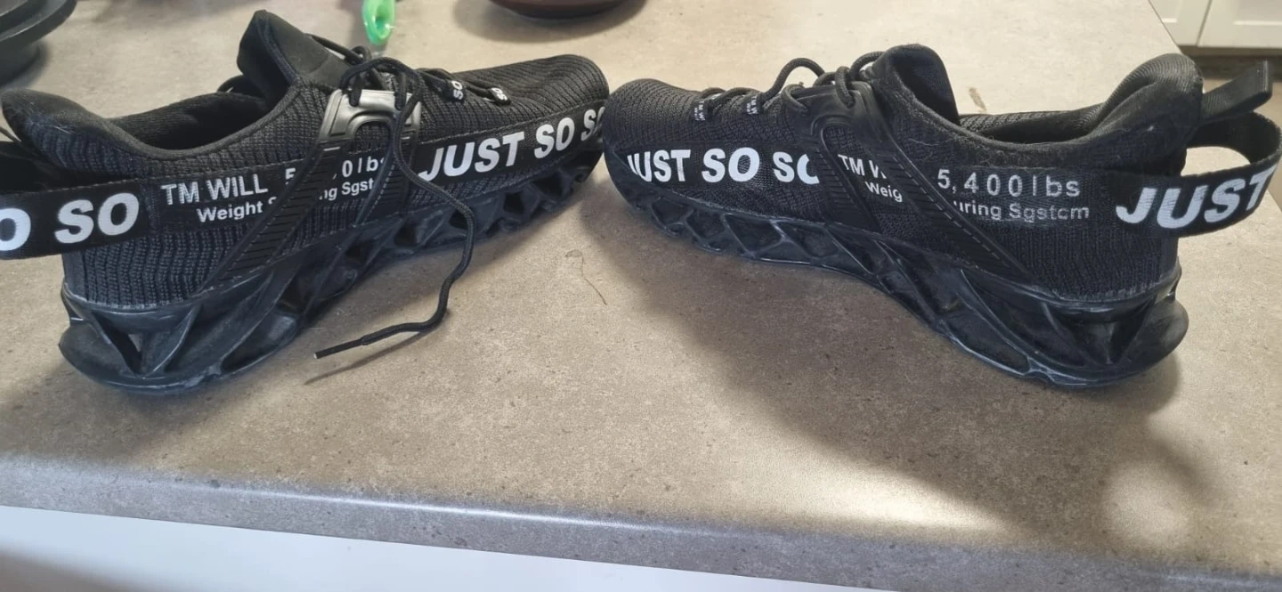 These black sneakers have "JUST SO SO" printed on the sides and back. The soles show "5,400lbs" and "TM W / Weiguring Sgstem". They feature a mesh upper and lace-up closure.