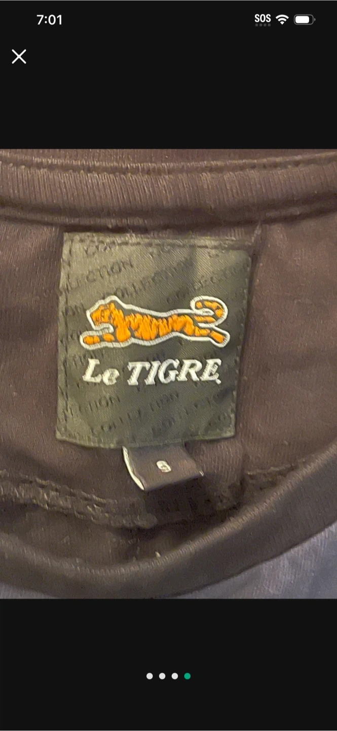 Selling a Le Tigre colorblock T-shirt in size S. The shirt features a unique design with black, purple, and navy panels, plus a neon green sleeve. It’s in great condition and ready for a new home!