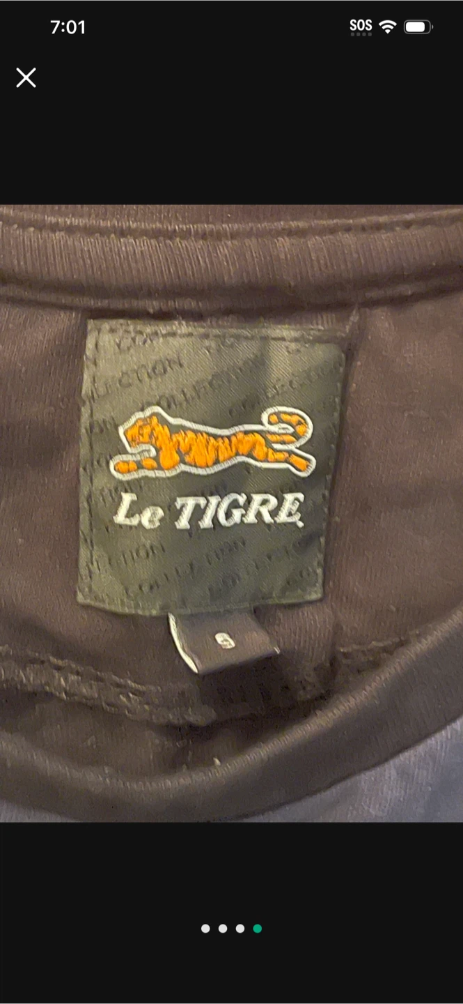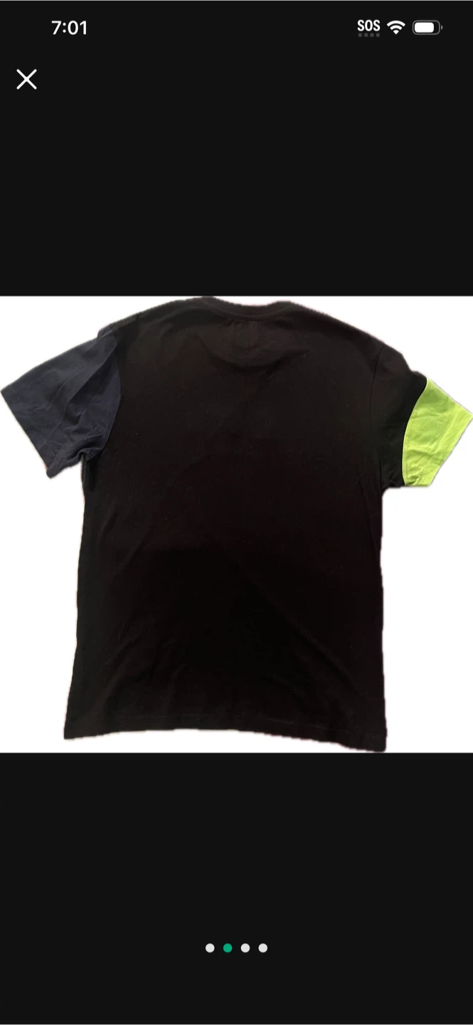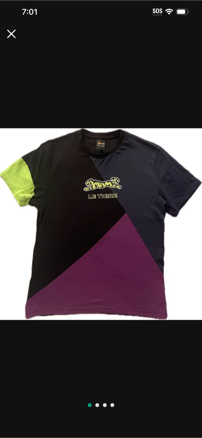 Selling a Le Tigre colorblock T-shirt in size S. The shirt features a unique design with black, purple, and navy panels, plus a neon green sleeve. It’s in great condition and ready for a new home!