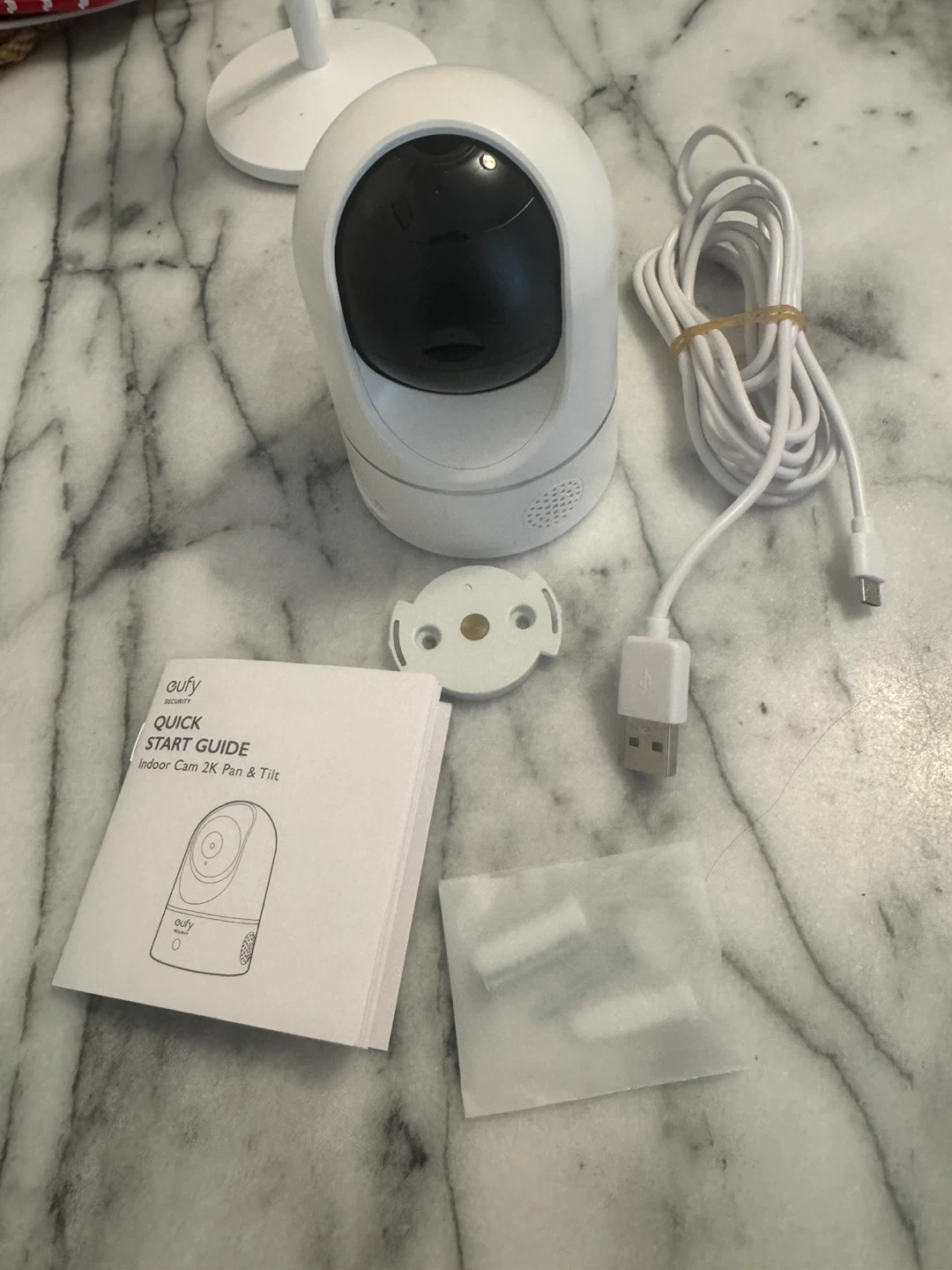 This eufy Security Indoor Cam E220 offers 2K resolution with pan and tilt capabilities. It's a Wi-Fi plug-in indoor security camera. It comes with a quick start guide and mounting hardware.