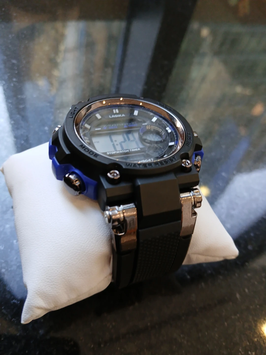 Lasika digital sport watch with stopwatch timer. Water resistant and features a black band with blue accents. Model W-H9047.