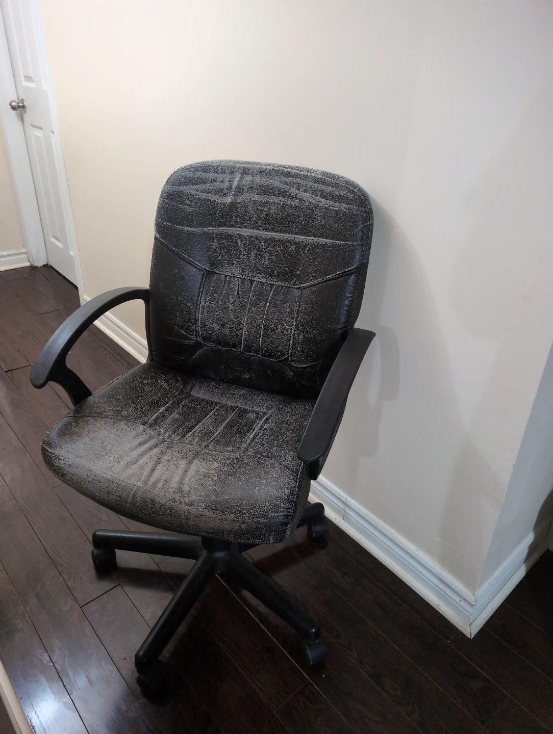 This is a black rolling office chair. It's made of faux leather and has adjustable height. The wear on the material is visible. 36 inch height.