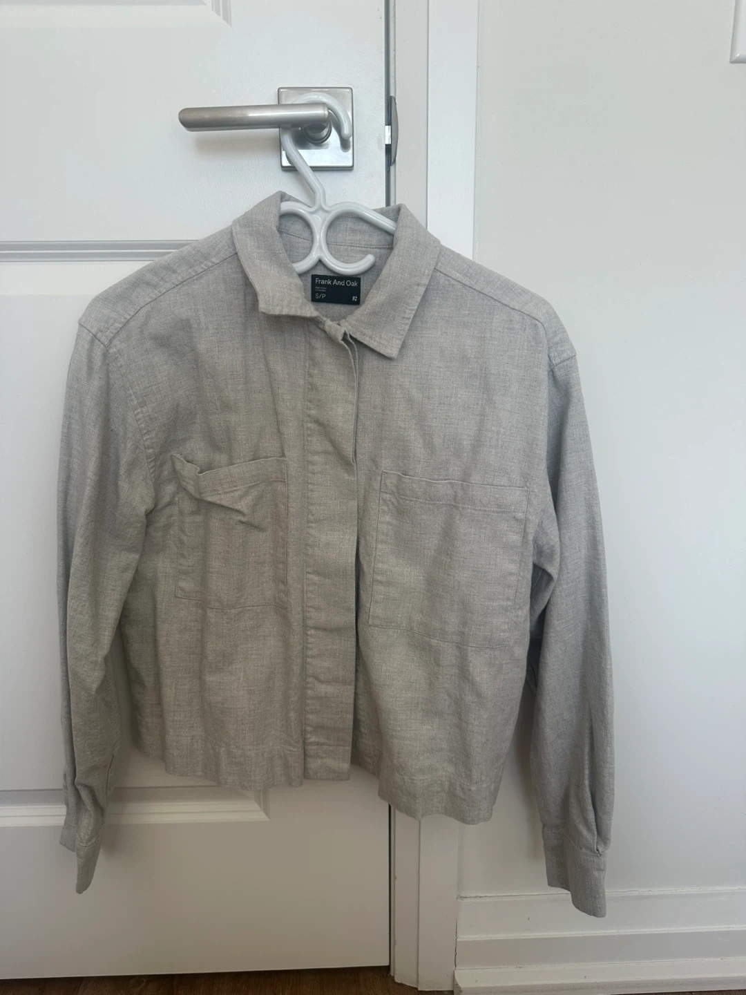 Frank And Oak shirt in a light grey colour. Made from 85% organic cotton and 15% linen. It features a button-up front and two chest pockets. Size S/P.