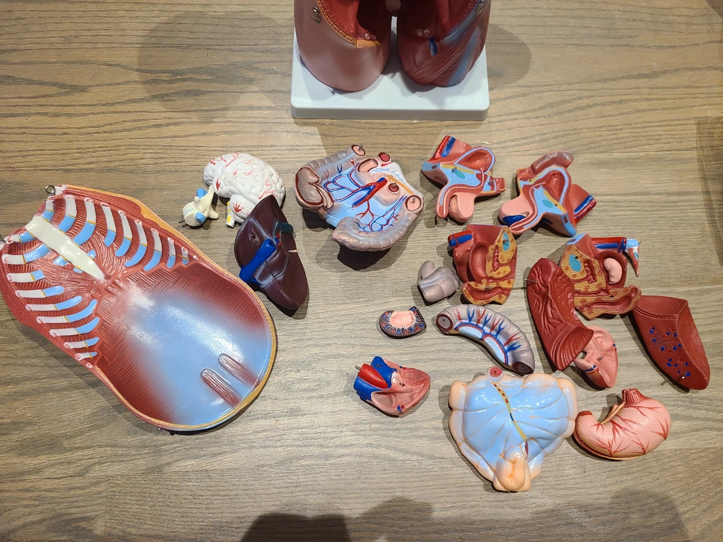 Selling a human torso anatomy model. It's a great for learning about the human body. It comes in multiple pieces that can be taken apart and reassembled to study the different organs and systems