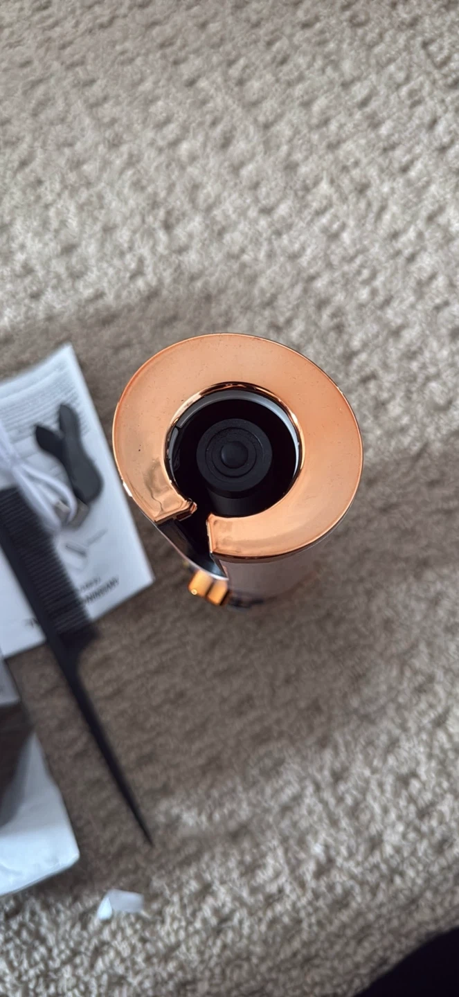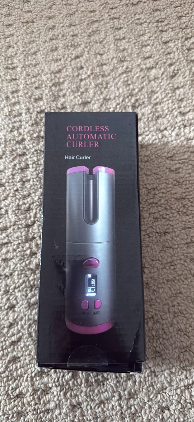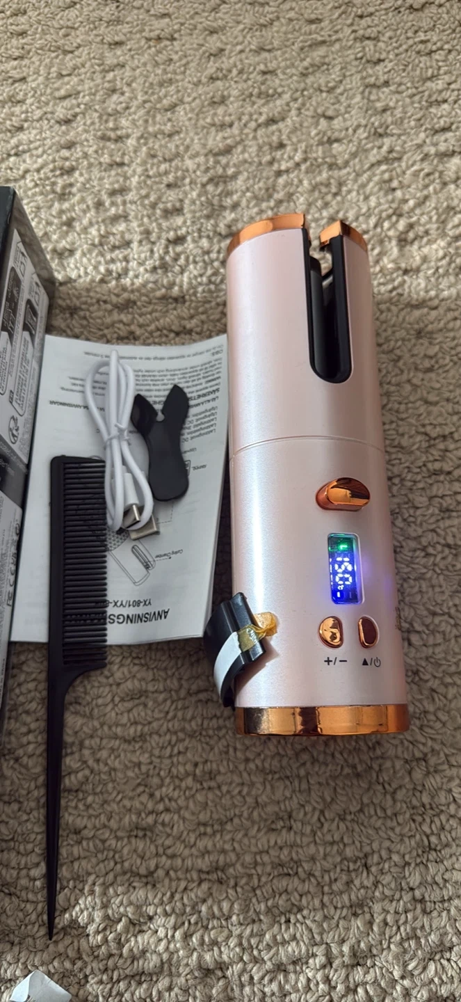 This is a cordless automatic hair curler. It includes the device, a USB charging cable, a comb, and a clip. The unit has an LCD display showing temperature and rotation settings.