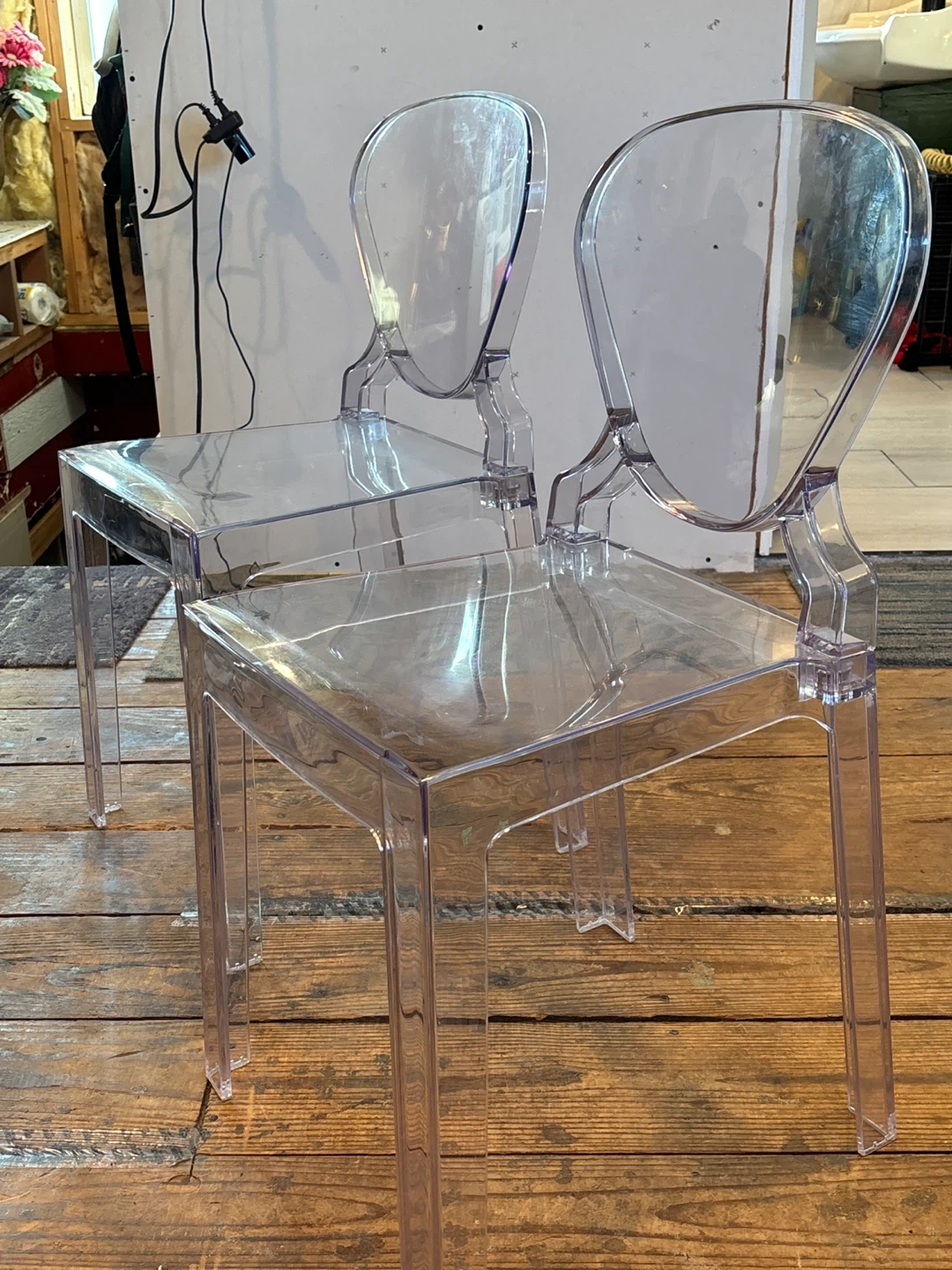This set includes two clear acrylic ghost chairs. They're made of transparent material and have a modern design. Perfect for adding a stylish touch to any room!