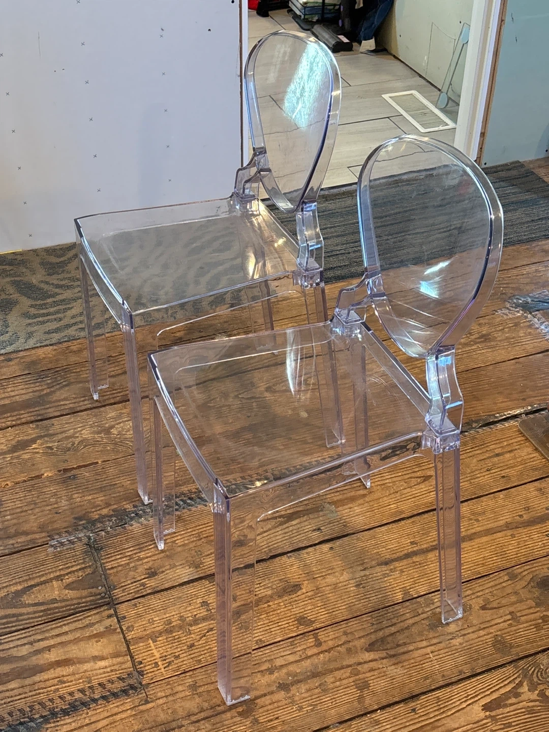 This set includes two clear acrylic ghost chairs. They're made of transparent material and have a modern design. Perfect for adding a stylish touch to any room!