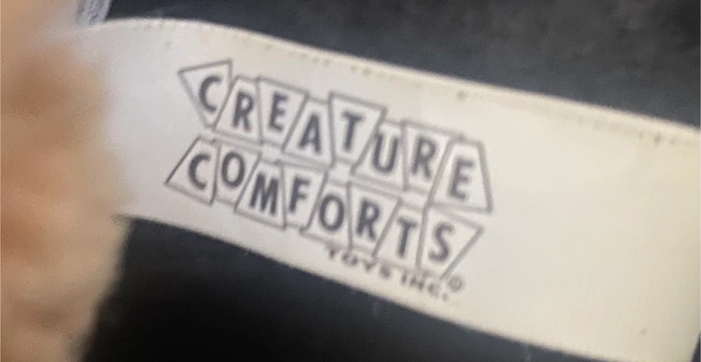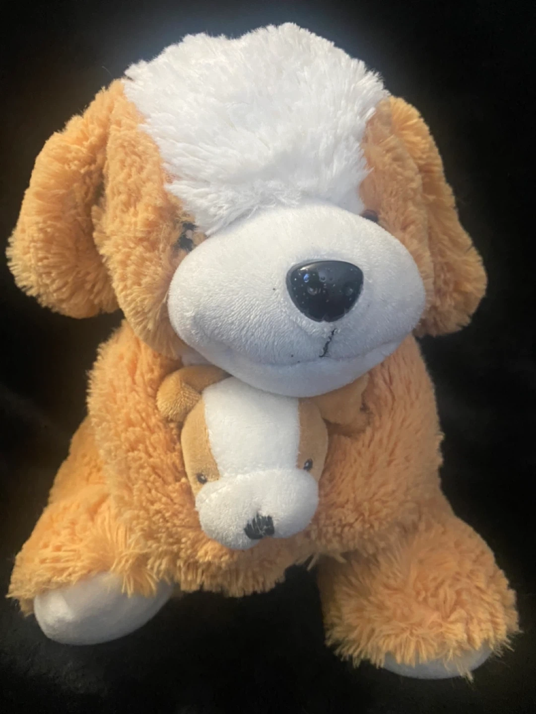 This is a cute and cuddly Creature Comforts plush dog, perfect for kids or collectors. It is in used, but like nee condition, and features a soft, huggable design with a smaller dog attached to its chest.
