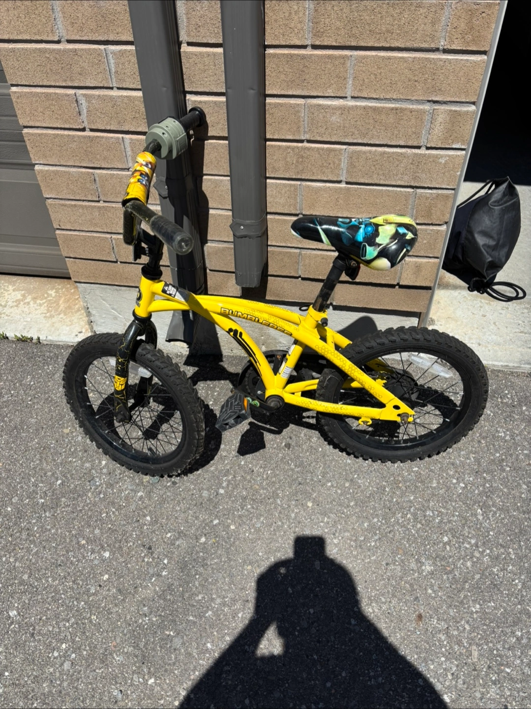 Yellow kids' bike. Transformers design. Small size, good for younger children. Shows some wear from use.