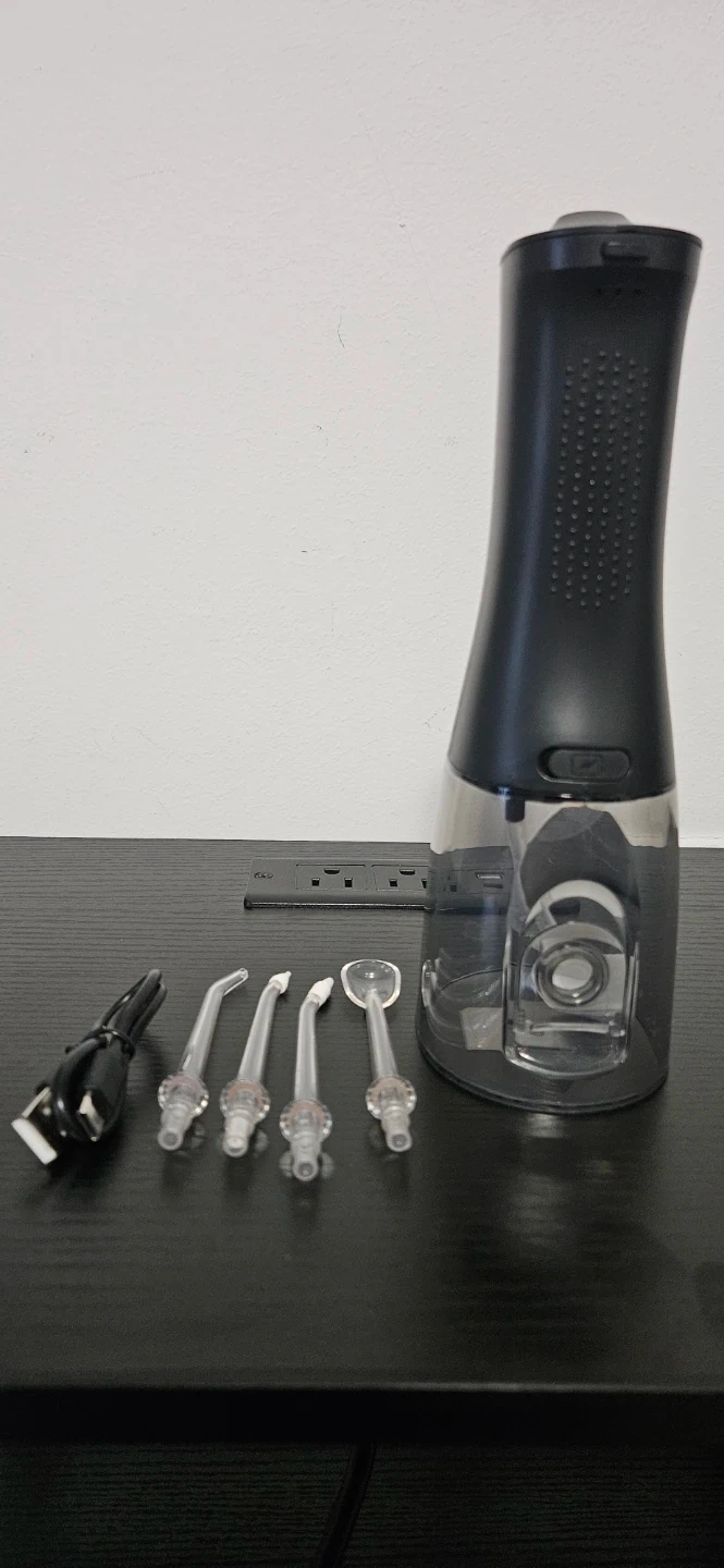 This OPERAN cordless oral irrigator comes with a USB charging cable and four different cleaning tips. It's IPX7 waterproof with 4 cleaning modes and a 360-degree rotation. The water tank has a generous capacity. It's handy for maintaining oral hygiene on the go!
