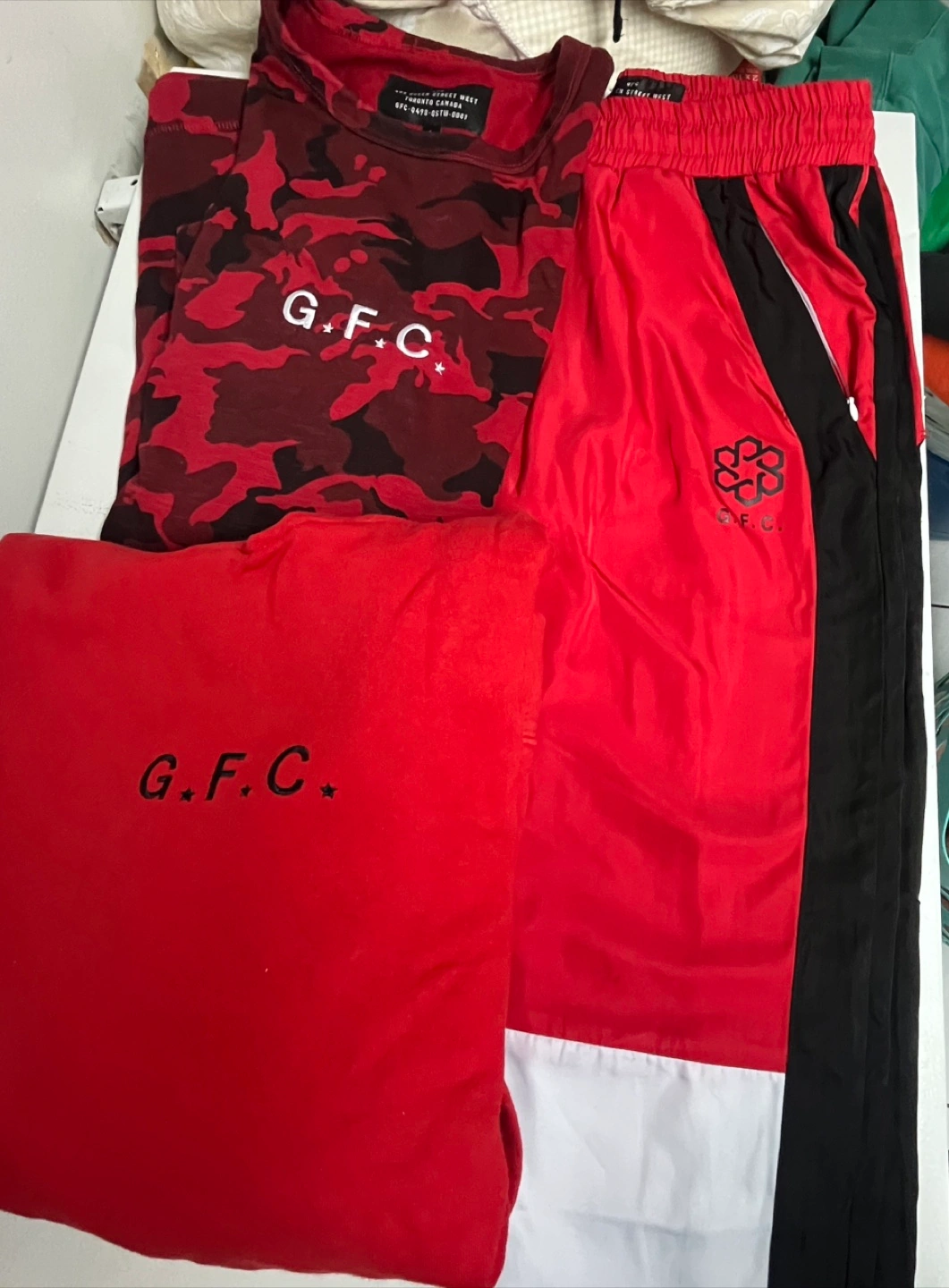 Selling a GFC matching set! Includes a red camouflage shirt and red pants, both size L. The shirt has a unique camouflage pattern, and the pants have a sporty design with black and white accents. Perfect for a casual and stylish look!