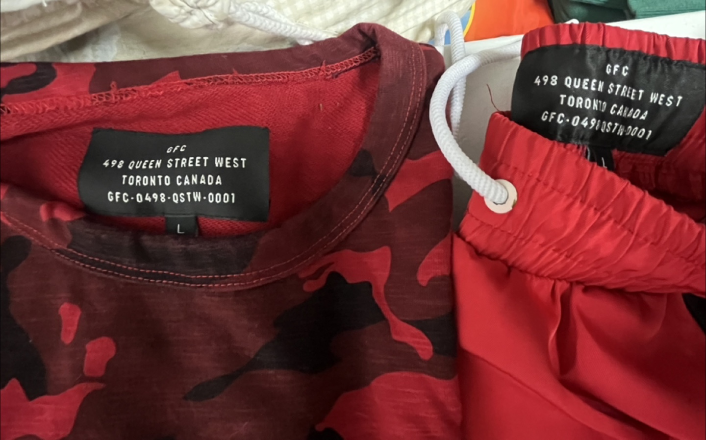 Selling a GFC matching set! Includes a red camouflage shirt and red pants, both size L. The shirt has a unique camouflage pattern, and the pants have a sporty design with black and white accents. Perfect for a casual and stylish look!