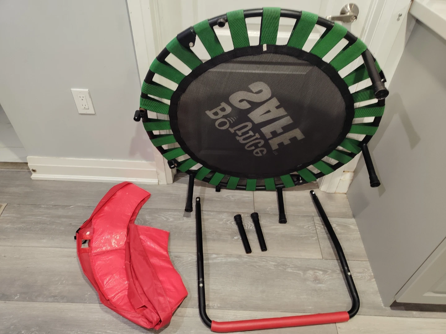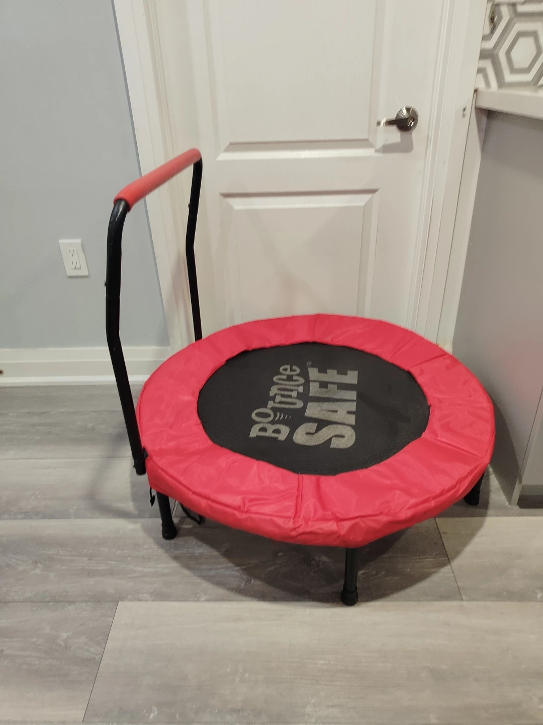 Selling a BounceSafe mini trampoline! It's great for a fun at home. The trampoline is in good condition and ready for a new owner. Perfect for indoor play. All parts can be dismantled and the ring also could be folded for easy storage or transportation