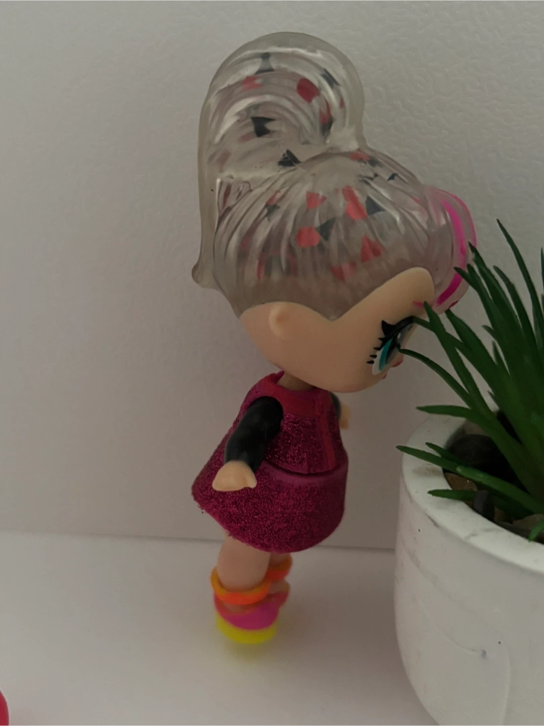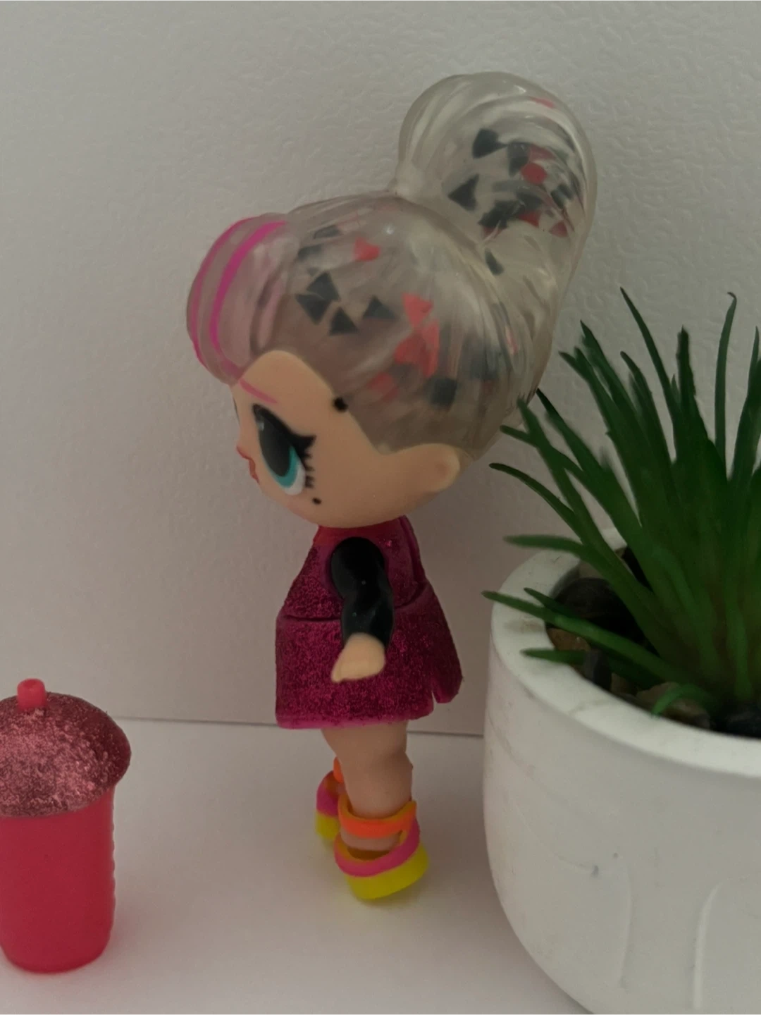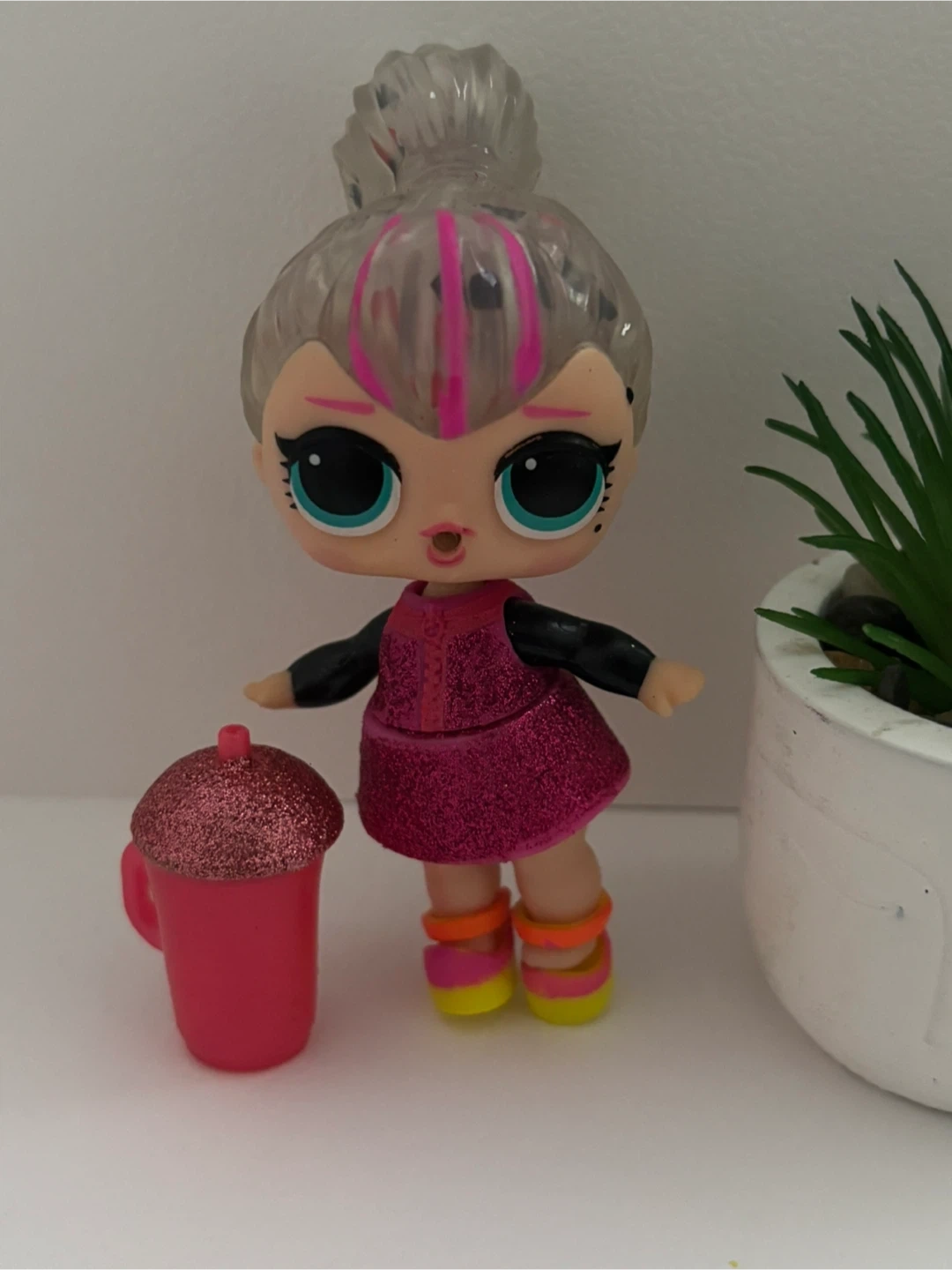 This is a LOL Surprise doll with a sparkly pink dress and black sleeves. It comes with a matching pink accessory cup. The doll has clear hair with pink and black highlights, and wears colourful shoes.