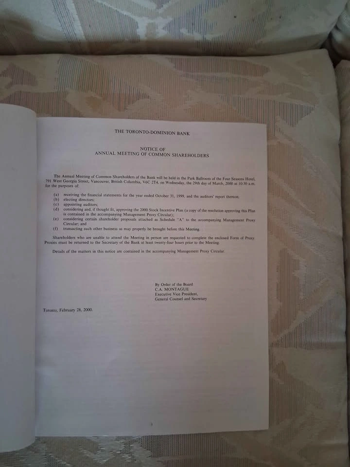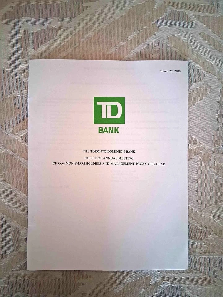 Buy & SellVintage 2000 TD Bank Notice of Annual MeetingVintage 2000 TD Bank Notice of Annual Meeting$10Available for pickup or public meetup in Mississauga. Cash and e-Transfer accepted.WHERE TO MEETBud Gregory Boulevard & Gatineau AvenueView MapSELLERRobert EHurontario717 reviews0 chats·0 favorites·6 viewsSEND CHAT TO SELLERHi Robert E! I’m interested in your listing.Hi Robert E! I’m interested in your listing.Get the Karrot app to chatSign In to chat