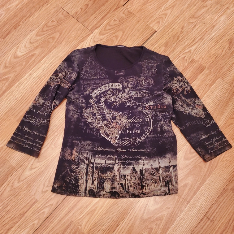 This is a vintage long sleeve top with a unique design. It features a detailed print with architectural and script elements. The material feels soft and comfortable, perfect for layering or wearing on its own. It's in great condition and ready for a new home!