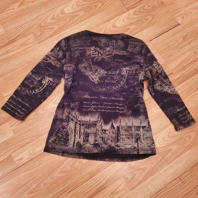 This is a vintage long sleeve top with a unique design. It features a detailed print with architectural and script elements. The material feels soft and comfortable, perfect for layering or wearing on its own. It's in great condition and ready for a new home!