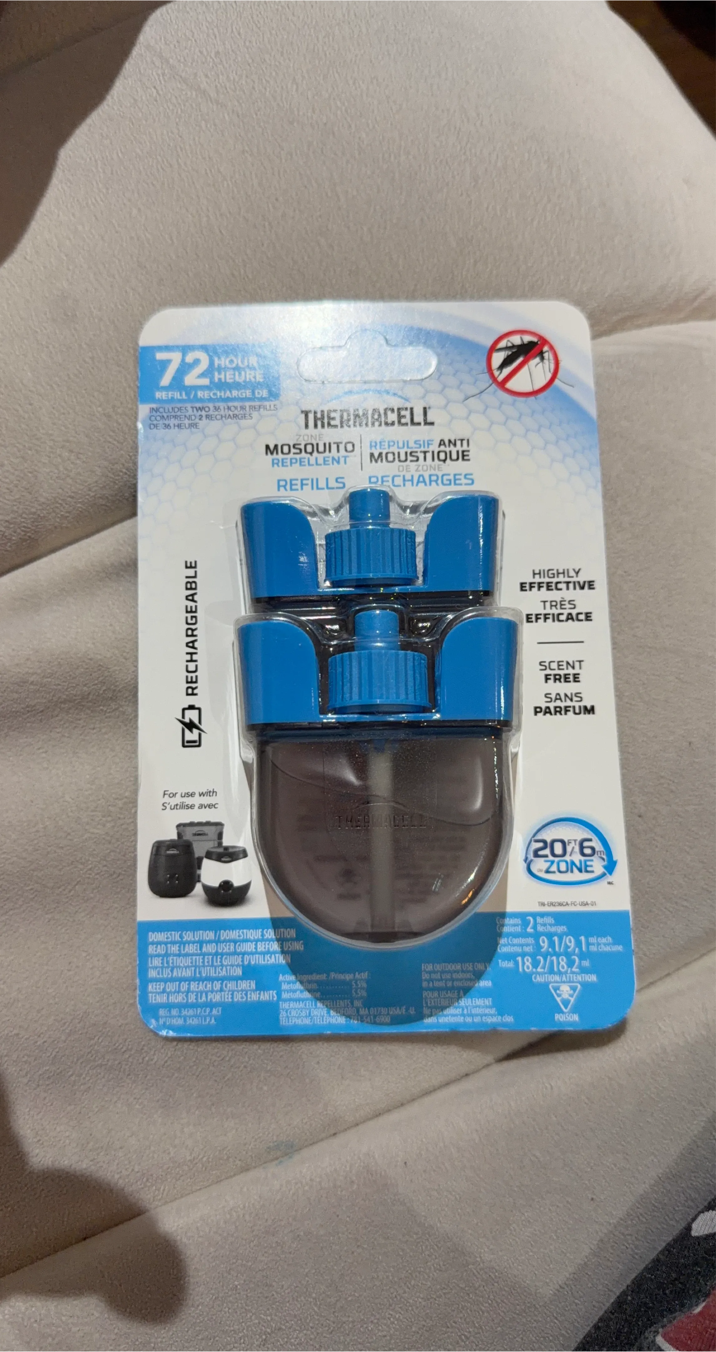 This package includes two 36-hour Thermacell mosquito repellent refills. It's highly effective and scent-free. Each refill contains 9.1 ml of solution for a total of 18.2 ml.