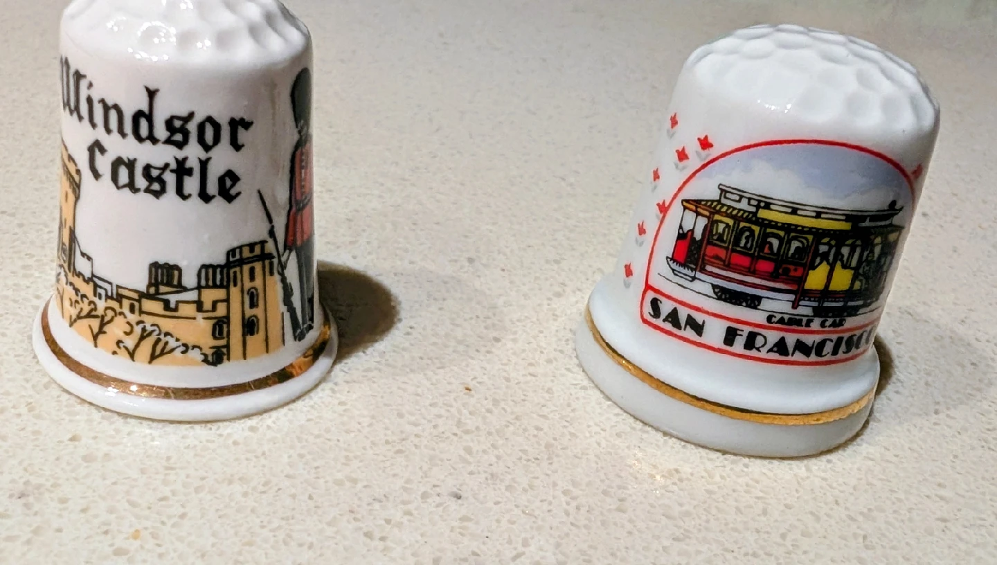 Selling two collectible thimbles! One features Windsor Castle and the other has a San Francisco cable car design. Both are in great condition and would make a lovely addition to any collection.