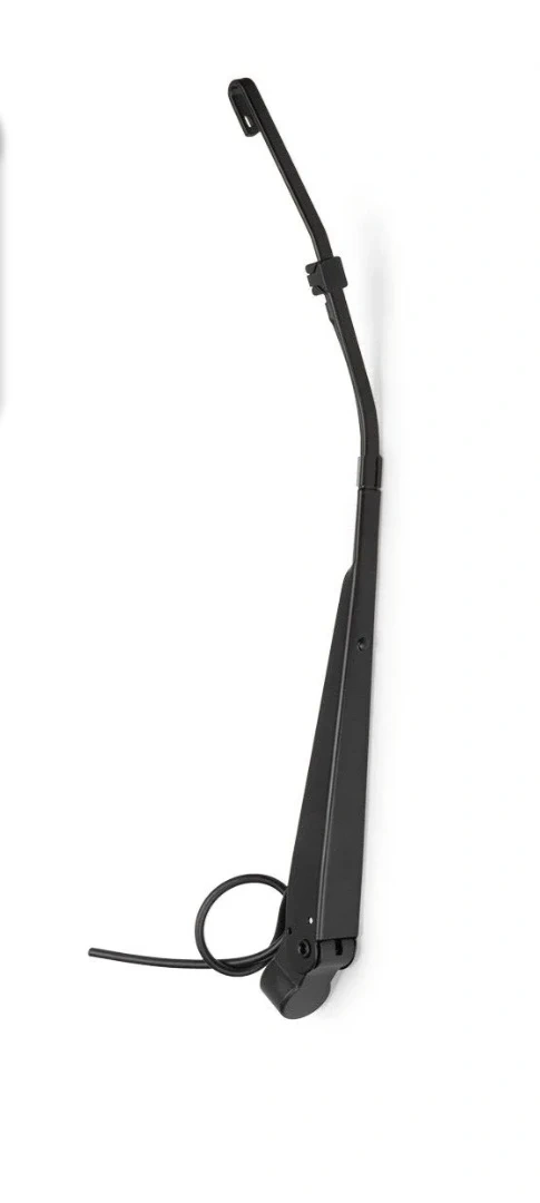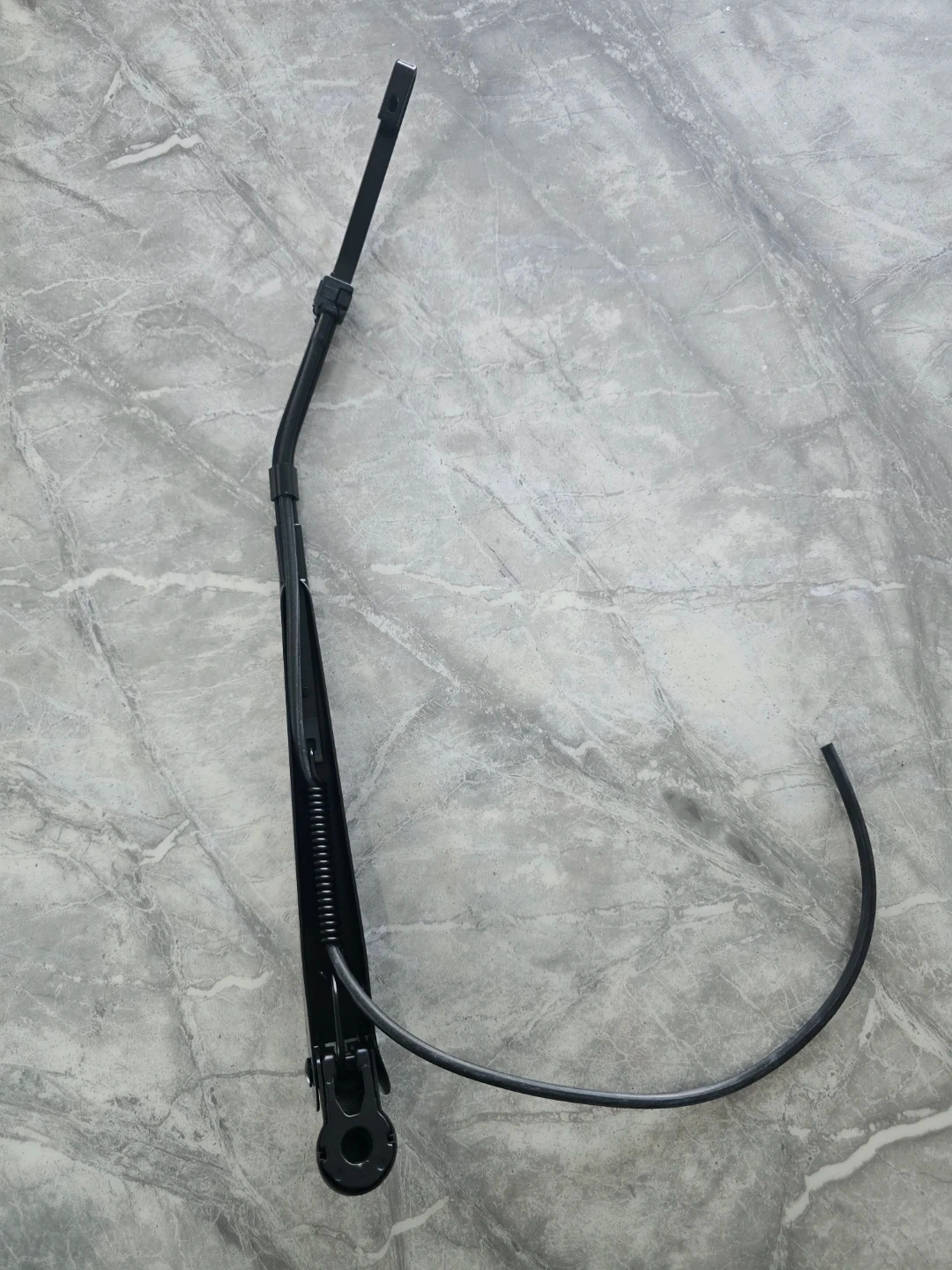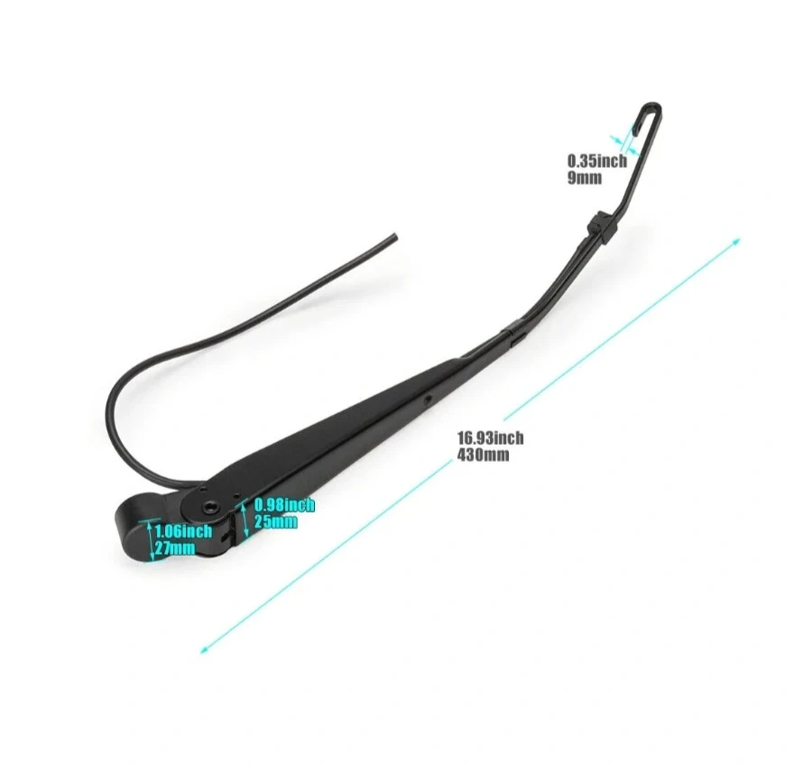 This is a black metal windshield wiper arm, measuring 16.93 inches or 430mm in length. It includes the arm and the rubber tube. The attachment point is 1.06 inches or 27mm. It has a hook end measuring 0.35 inches or 9mm.