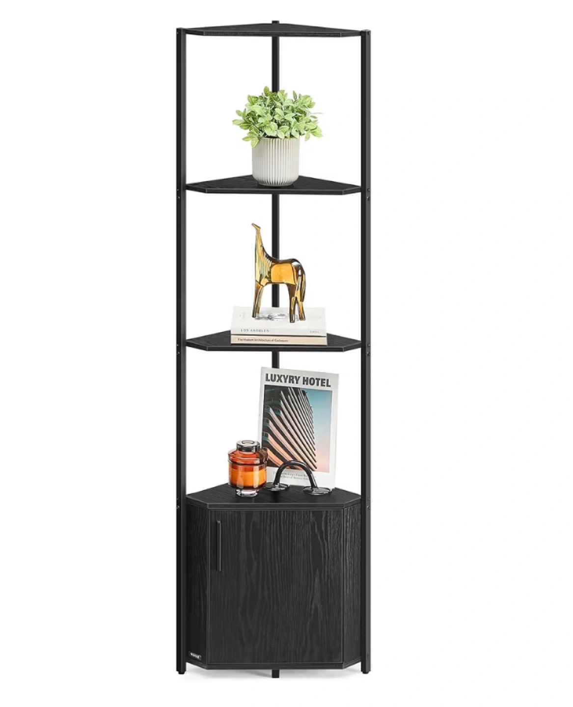 This VASAGLE corner shelf unit features 4 tiers for display and storage. It's made of durable materials and includes a convenient lower cabinet with a door. Each shelf supports up to 48.5 lb (22 kg). It's 58" (147.3 cm) tall.