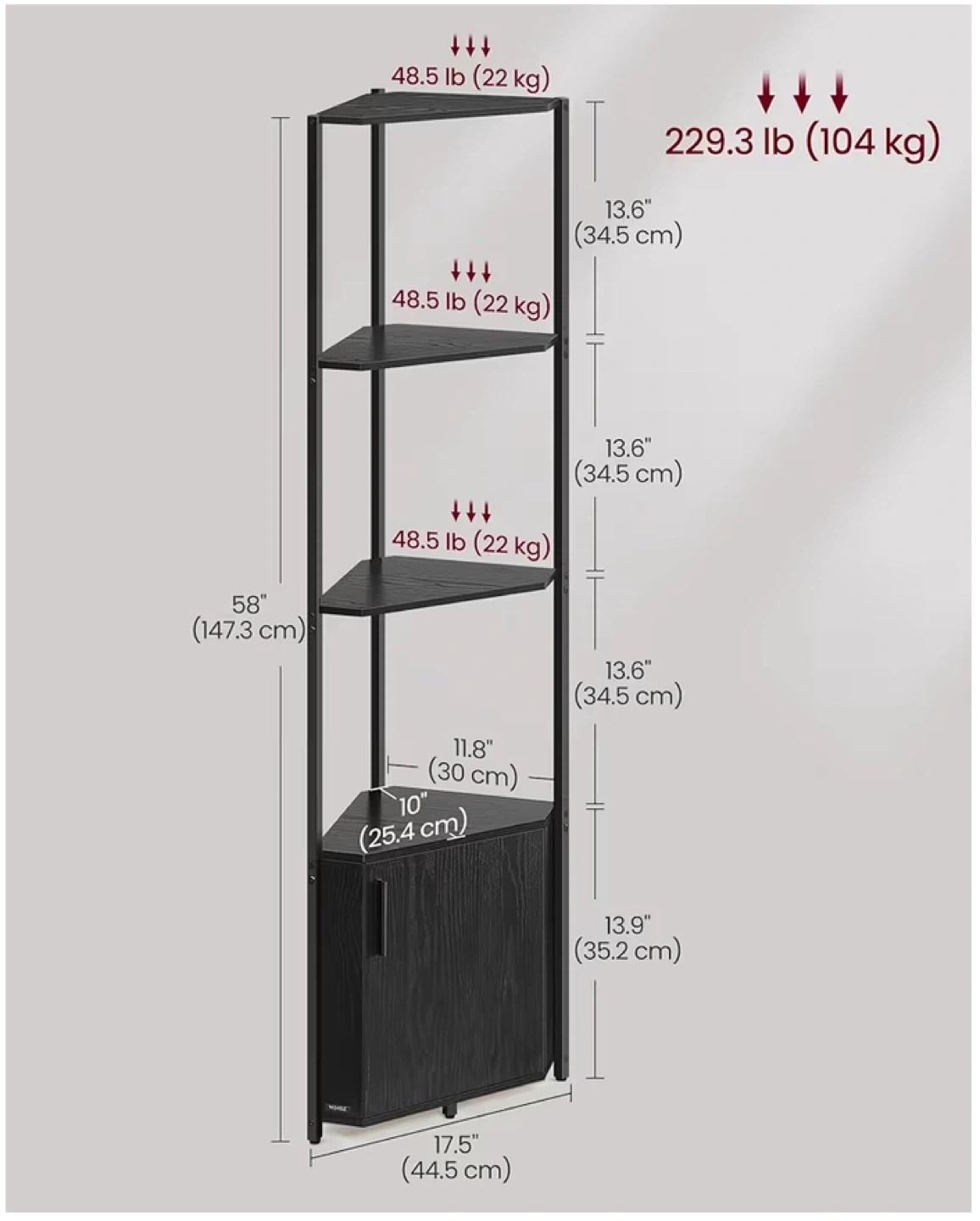 This VASAGLE corner shelf unit features 4 tiers for display and storage. It's made of durable materials and includes a convenient lower cabinet with a door. Each shelf supports up to 48.5 lb (22 kg). It's 58" (147.3 cm) tall.