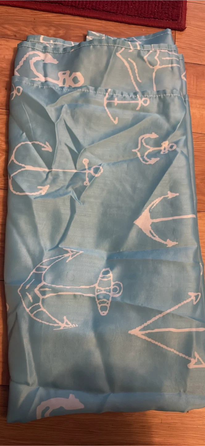 This is a light blue shower curtain featuring a pattern of white anchors. It's made of fabric and is ready to add a nautical touch to your bathroom. The curtain measures standard size.