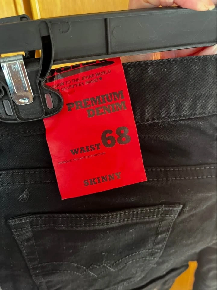 Sleek black skinny jeans by Indigo. Slim fit through hip and leg. Simple five-pocket styling. Easy to pair with casual or dressy tops. Size “waist 68” translates to 26.5-27 inches. New with Tag.