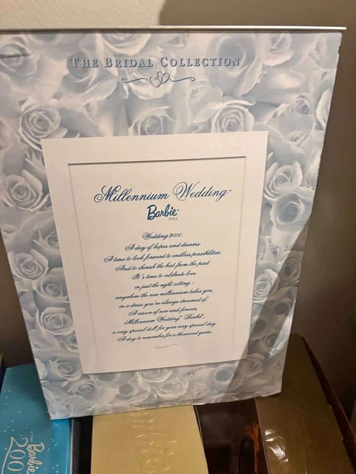 Celebrate timeless elegance with this Millennium Wedding Barbie, part of The Bridal Collection. Released as a Collector Edition, this stunning Barbie wears a beautiful white satin wedding gown with delicate lace details, a long flowing veil, and elegant gloves. She holds a classic bridal bouquet, and her jewelry set adds a touch of sophistication. This is the first doll in the series, making it a perfect piece for collectors or as a sentimental wedding gift.