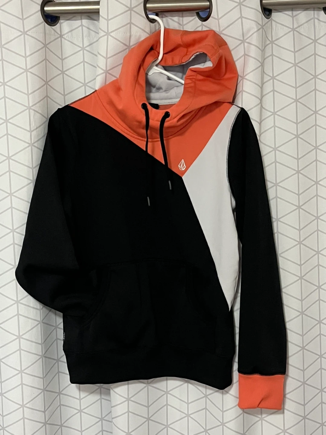 This is a Volcom hoodie with a colour block design. It's black, orange, and white. Features a front pocket and hood.