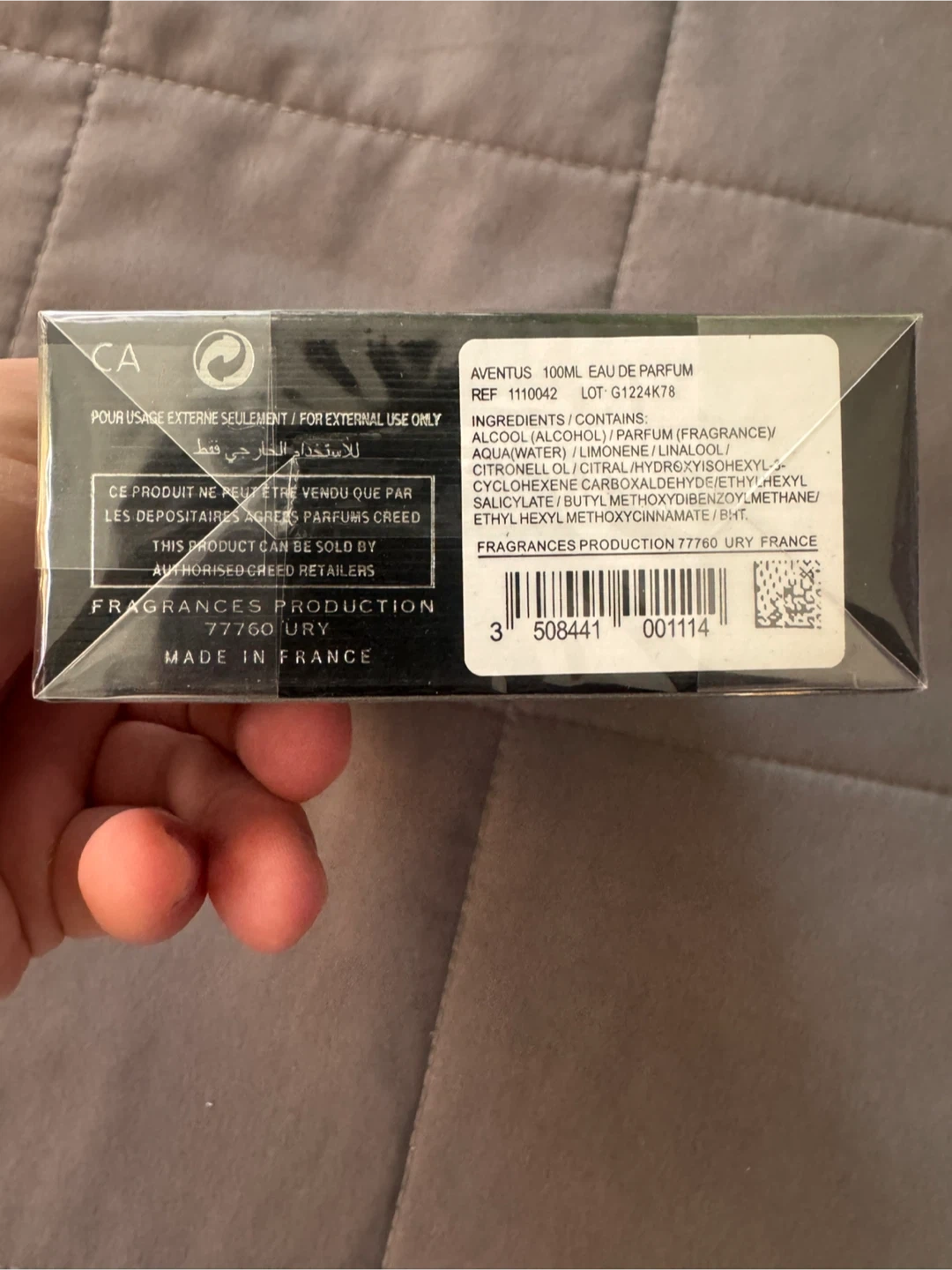 This is a 100ml bottle of Creed Aventus Eau de Parfum. It's a fragrance production from France. The bottle is sealed.