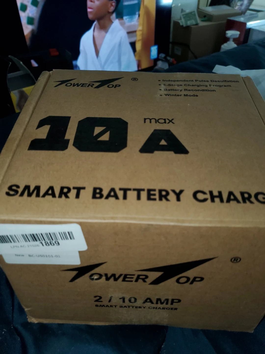 This is a POWER TOP 10A smart battery charger. It supports 6V and 12V batteries. It features independent pulse desulfation, a 5-stage charging program, battery recondition, and winter mode. Quick charge is 10A, with a 2A trickle charge option.