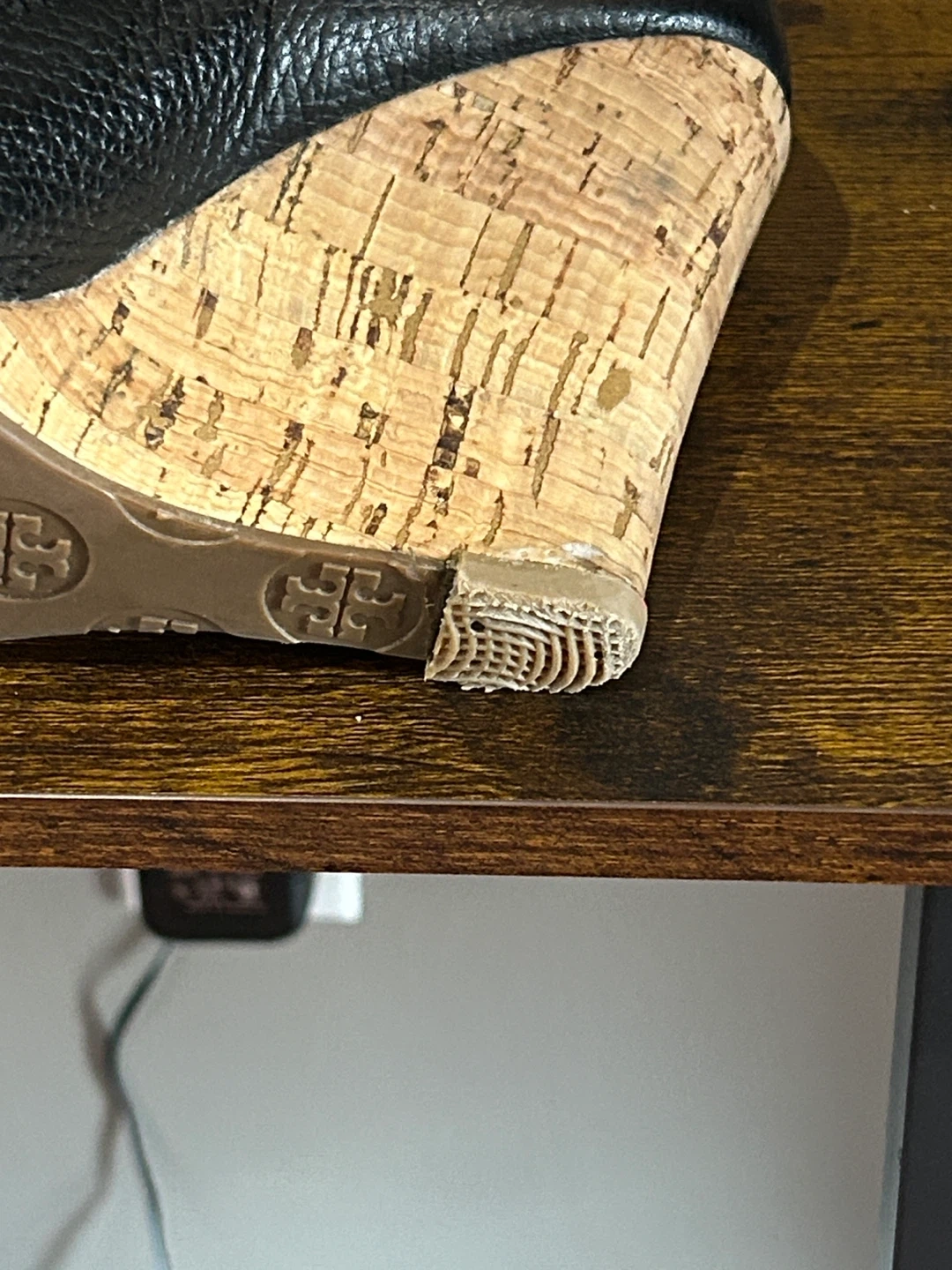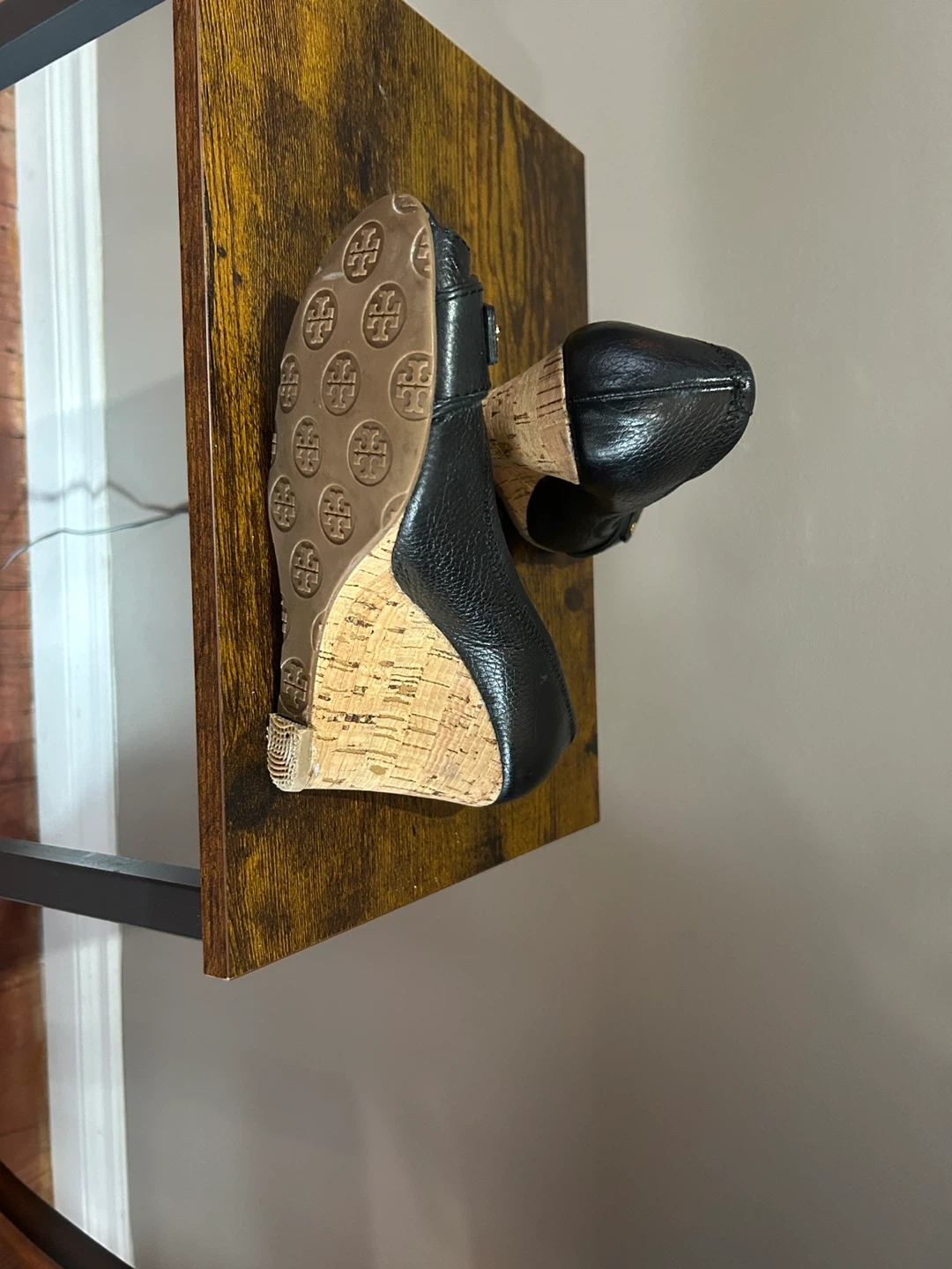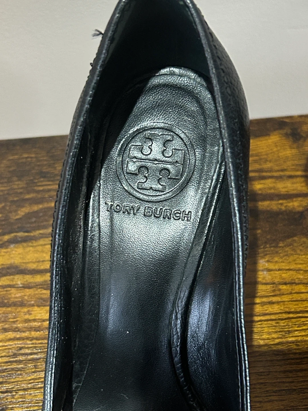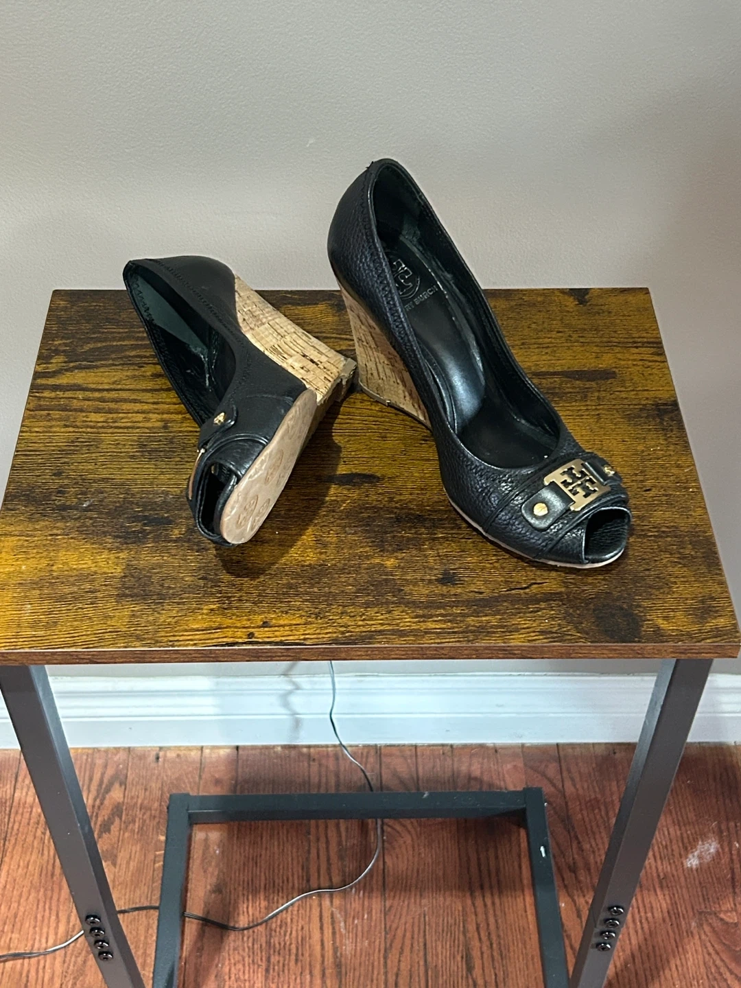 Tory Burch Black Leather Peep-Toe Wedge Heels Size 8M