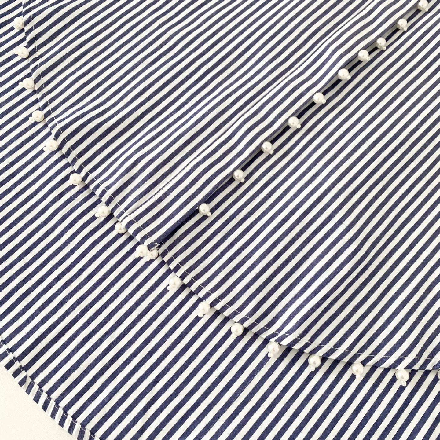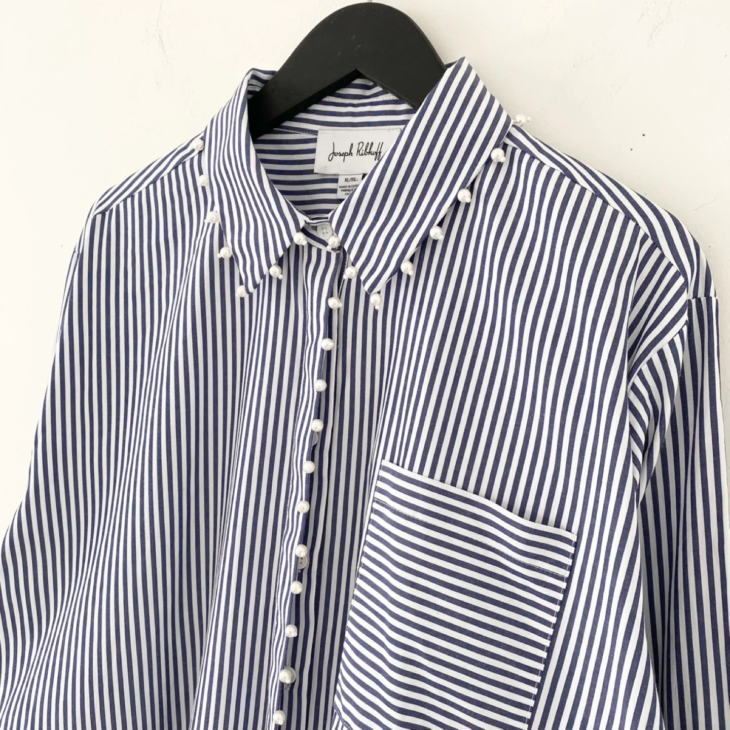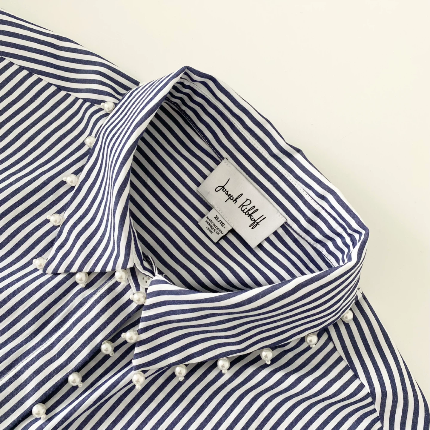 Joseph Ribkoff button-up shirt with pearl embellishment. Made of lightweight cotton blend fabric in blue and white stripe. It doesn't wrinkle easily and drapes beautifully. There's no staining or damage. It's clean and in excellent condition.