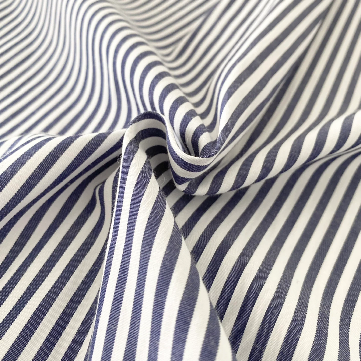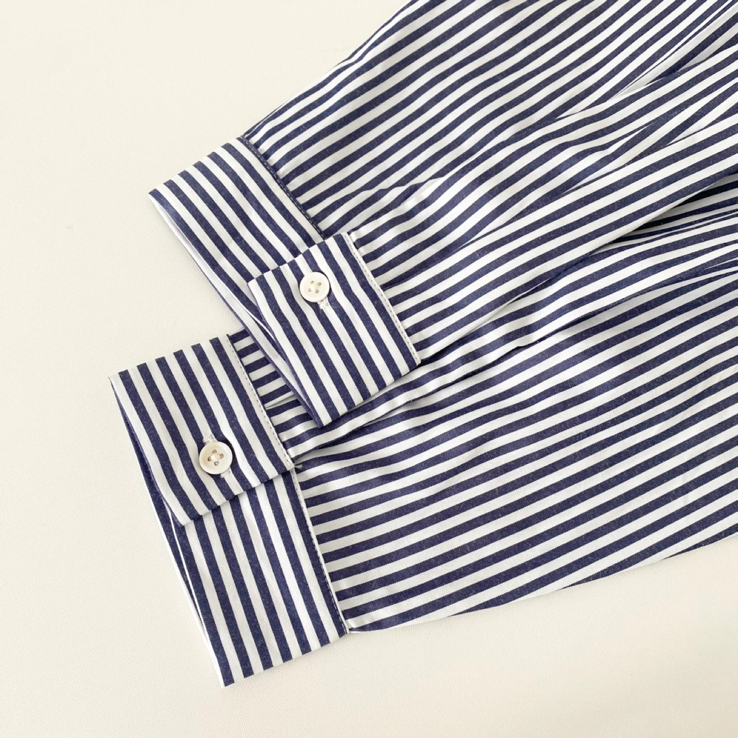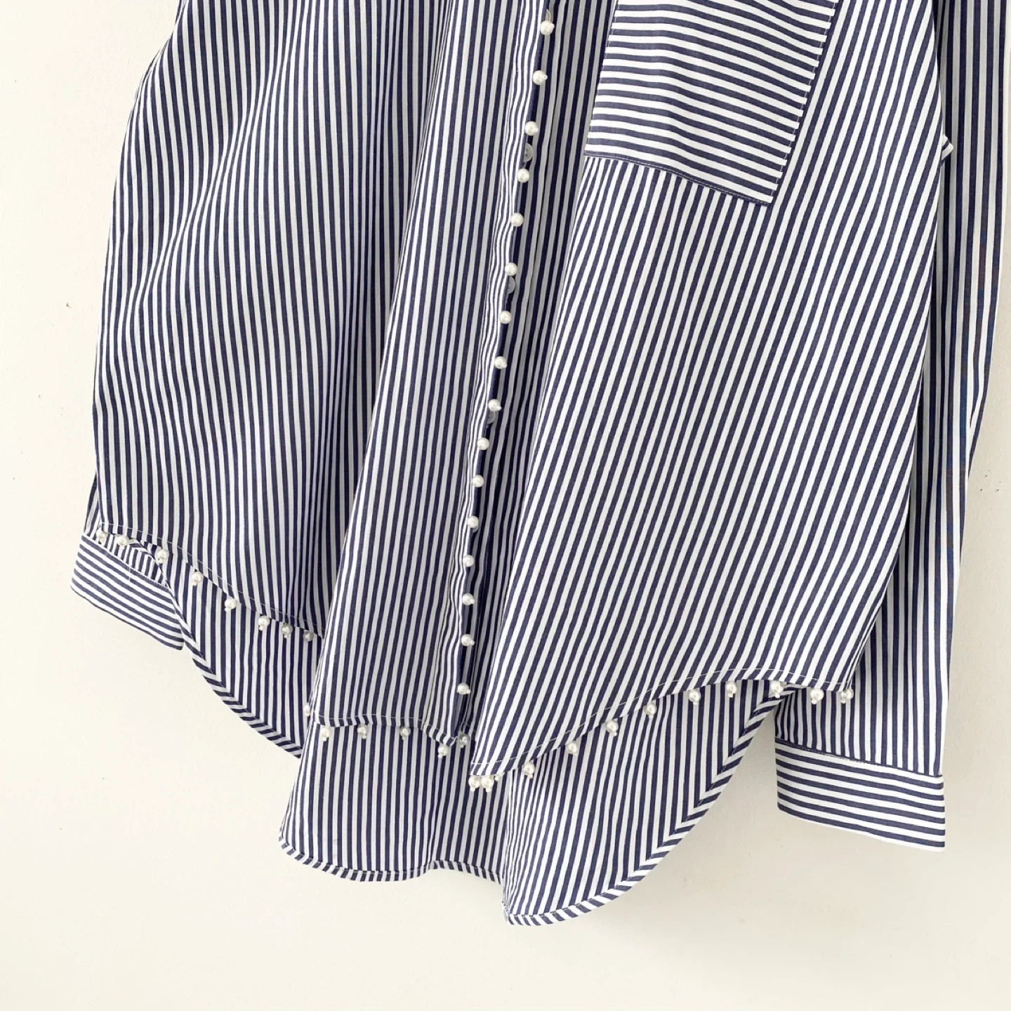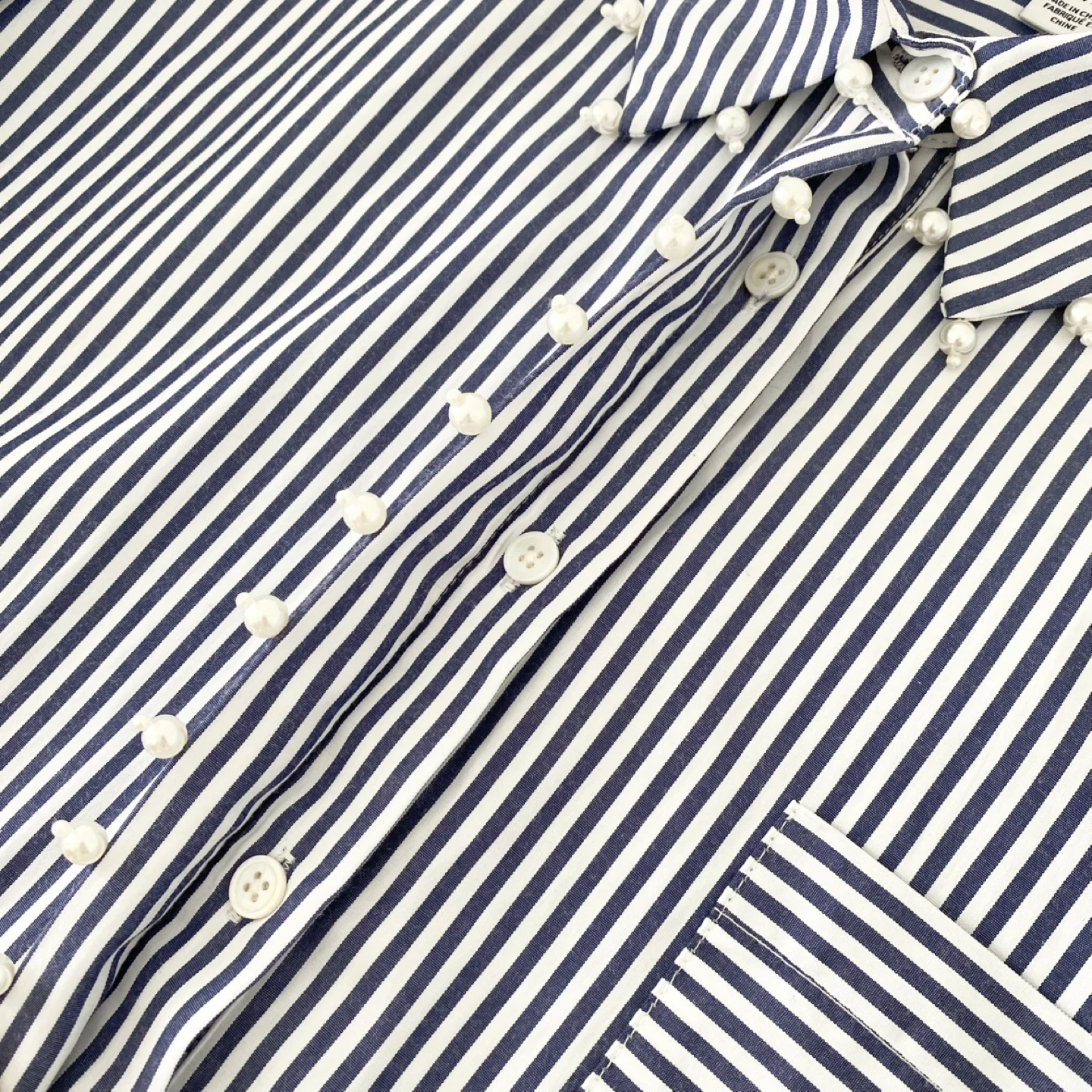 Joseph Ribkoff button-up shirt with pearl embellishment. Made of lightweight cotton blend fabric in blue and white stripe. It doesn't wrinkle easily and drapes beautifully. There's no staining or damage. It's clean and in excellent condition.
