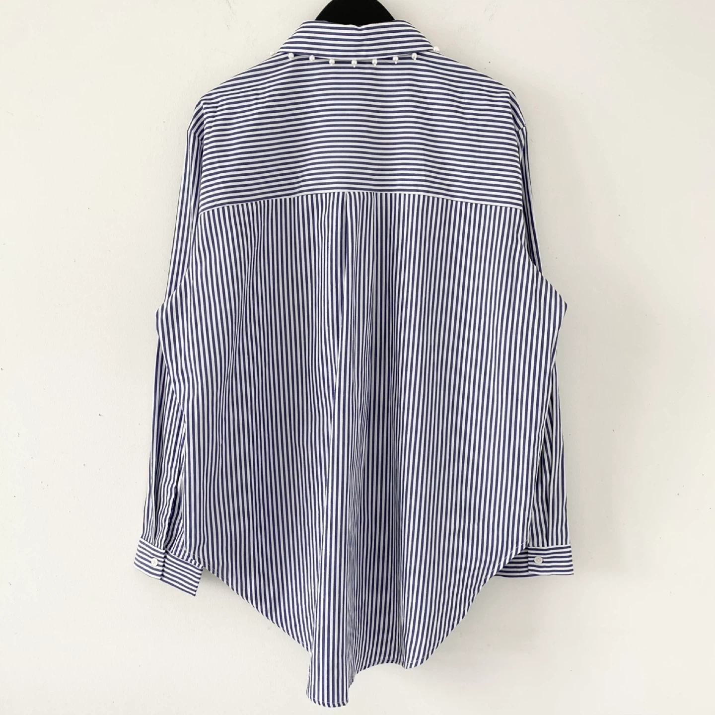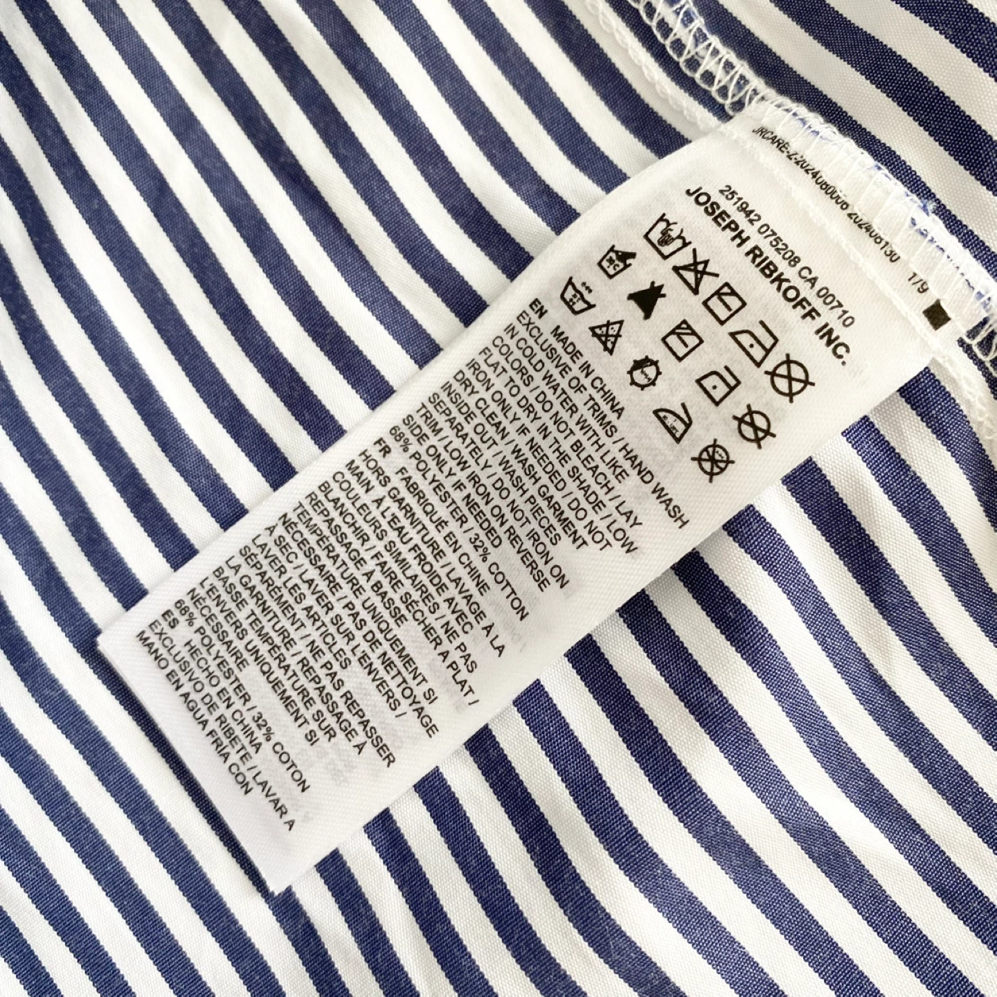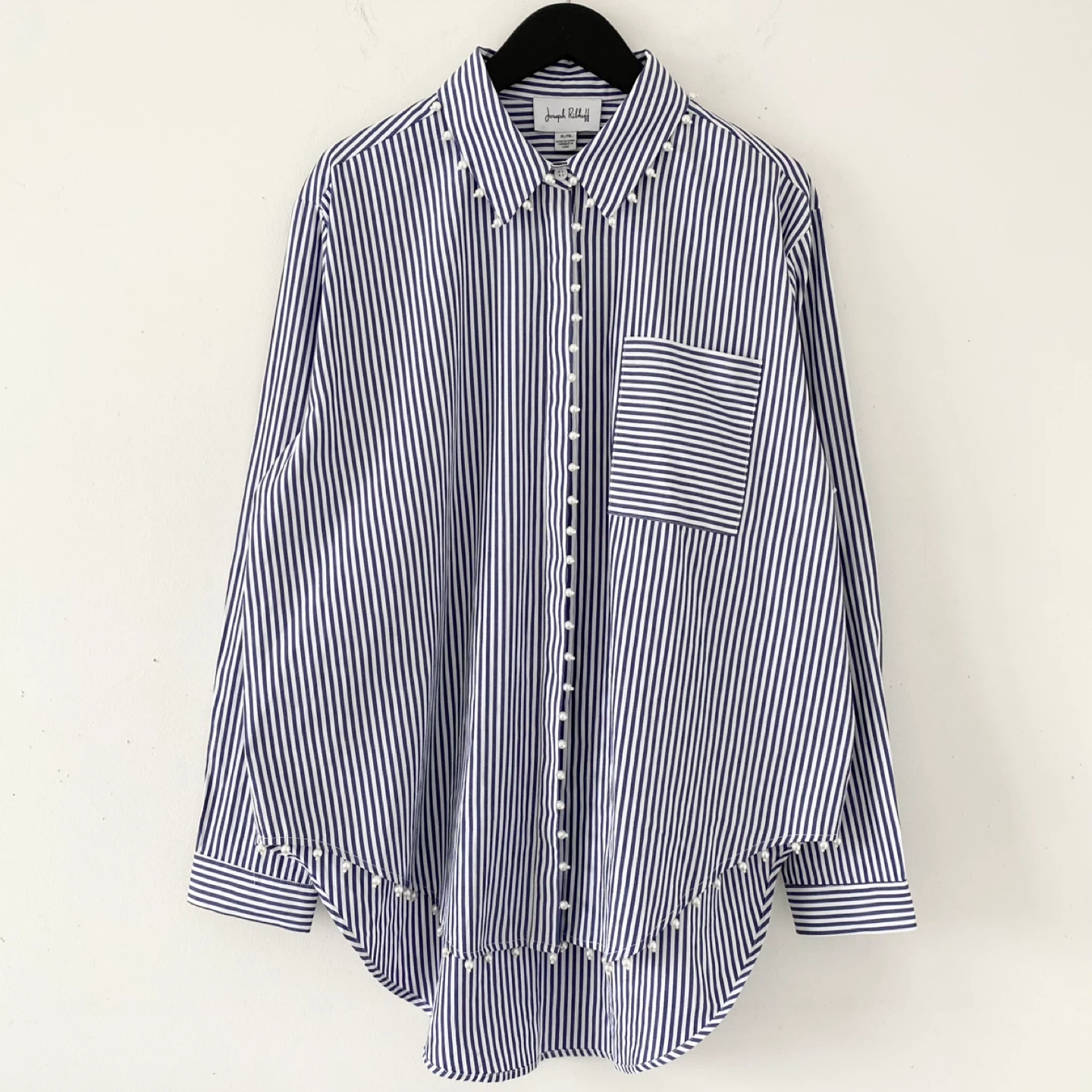 Joseph Ribkoff button-up shirt with pearl embellishment. Made of lightweight cotton blend fabric in blue and white stripe. It doesn't wrinkle easily and drapes beautifully. There's no staining or damage. It's clean and in excellent condition.