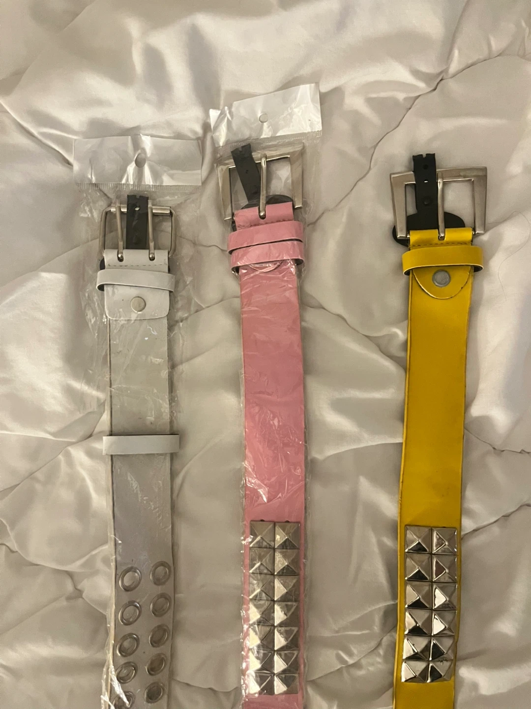 Three studded belts in white, pink, and yellow. Each belt features grommets and metal stud detailing. They're perfect for adding a bit of flair to any outfit!