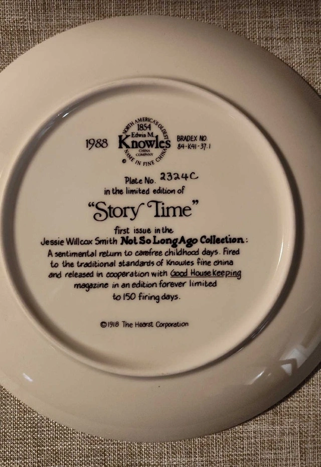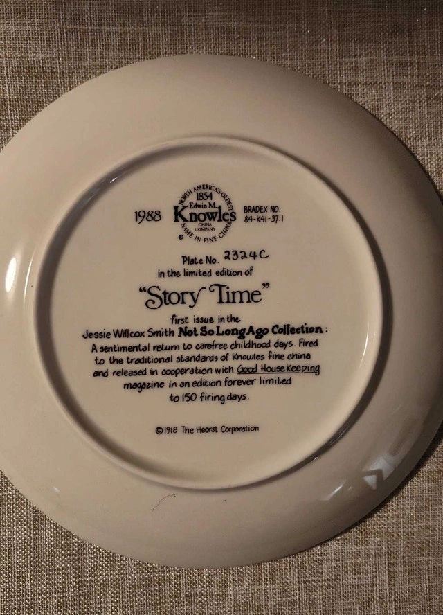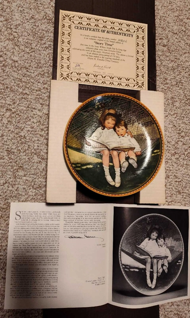 This is a used Knowles Story Time collector plate, the first issue in the Jessie Willcox Smith Not So Long Ago Collection. It is in good condition and comes with its certificate of authenticity and informational booklet. Pick up in the Lisgar area of Mississauga. Cash accepted.
