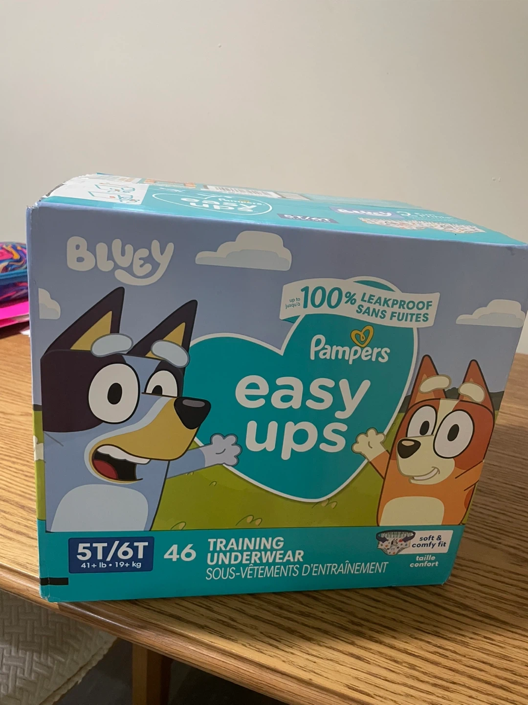 Pampers Easy Ups training underwear featuring Bluey characters. This box contains 46 training underwear in size 5T/6T, suitable for children weighing 41-19+ lbs. They offer 100% leakproof protection and a soft, comfy fit. Perfect for toddlers during their potty training journey! . 46 Total