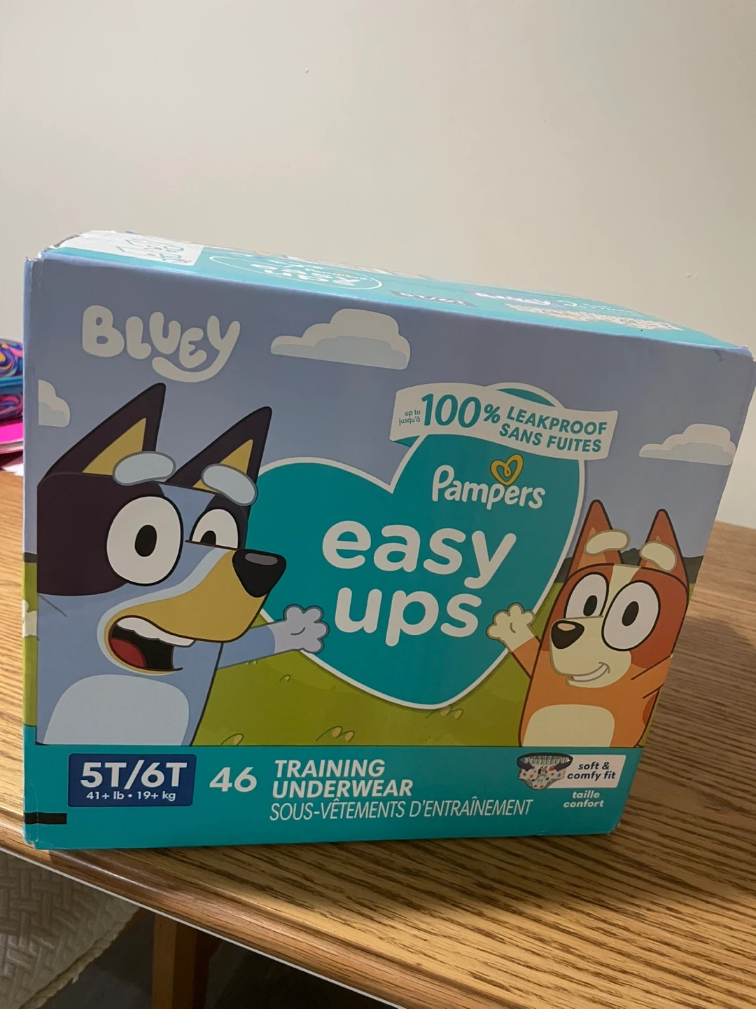 Pampers Easy Ups training underwear featuring Bluey characters. This box contains 46 training underwear in size 5T/6T, suitable for children weighing 41-19+ lbs. They offer 100% leakproof protection and a soft, comfy fit. Perfect for toddlers during their potty training journey! . 46 Total