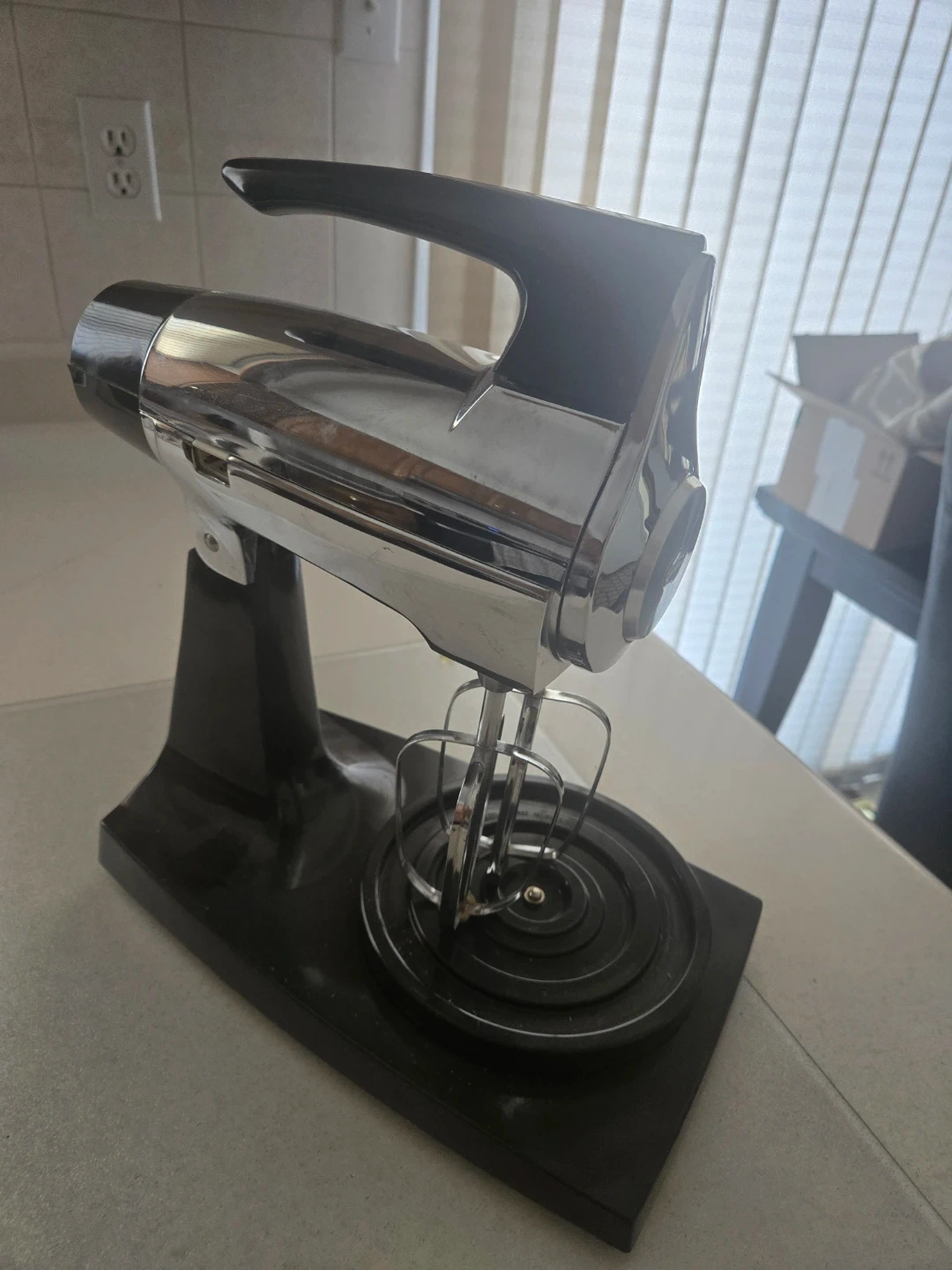 This is a Vintage Sunbeam Mixmaster chrome hand mixer. It comes with beaters and a black base. This mixer is ideal for everyday baking needs. I cant find cord!