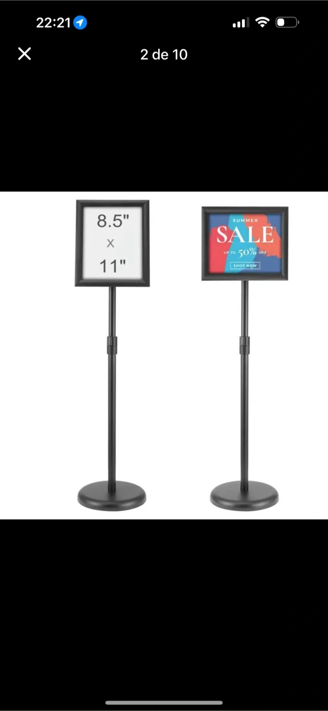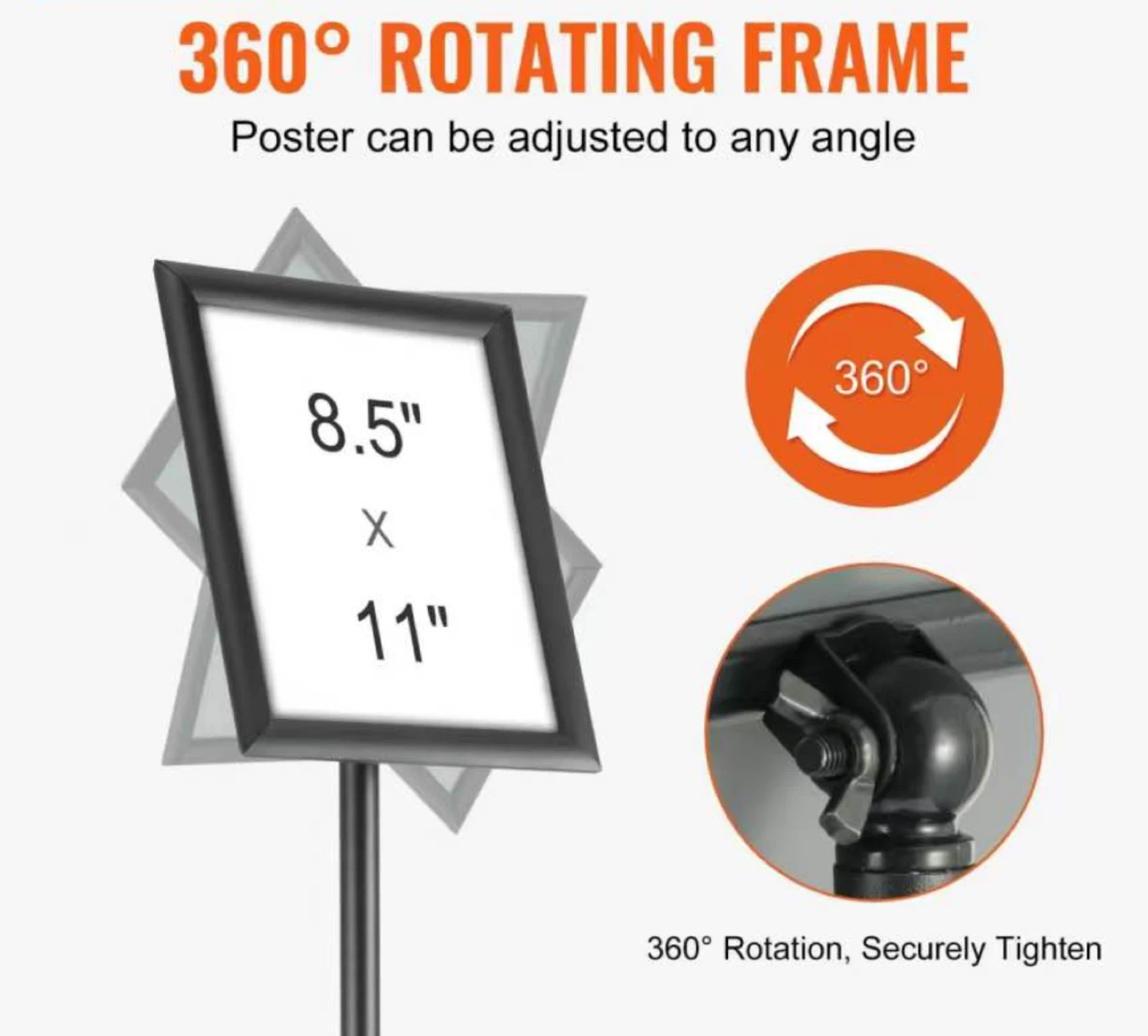 Selling a sign holder stand that holds 8.5x11 inch signs! It has an adjustable height and a 360° rotating frame, so posters can be adjusted to any angle. It also has an adjustable rod with a locking mechanism for easy extension. Comes in the original box!