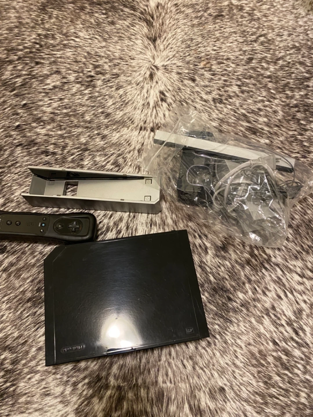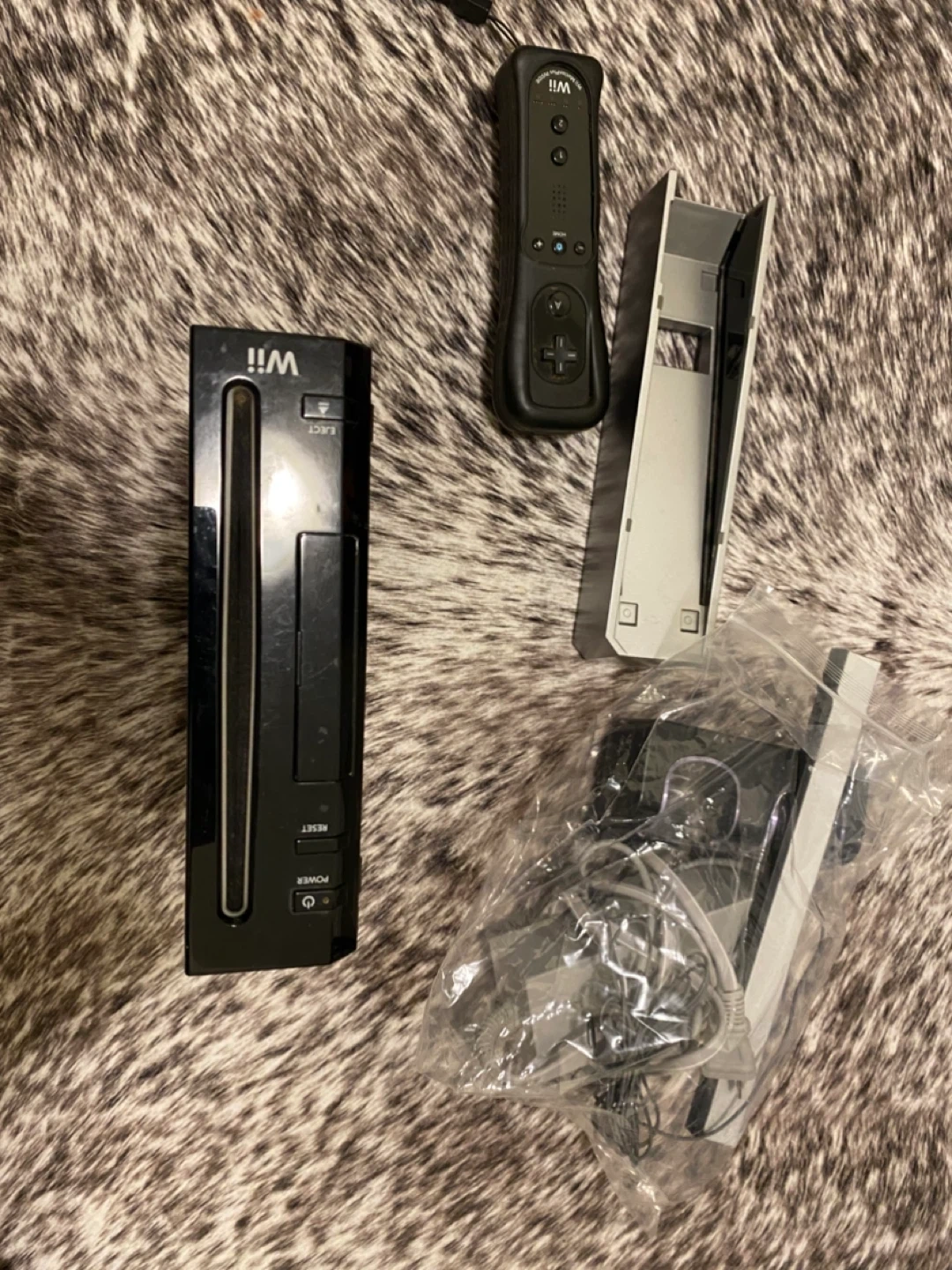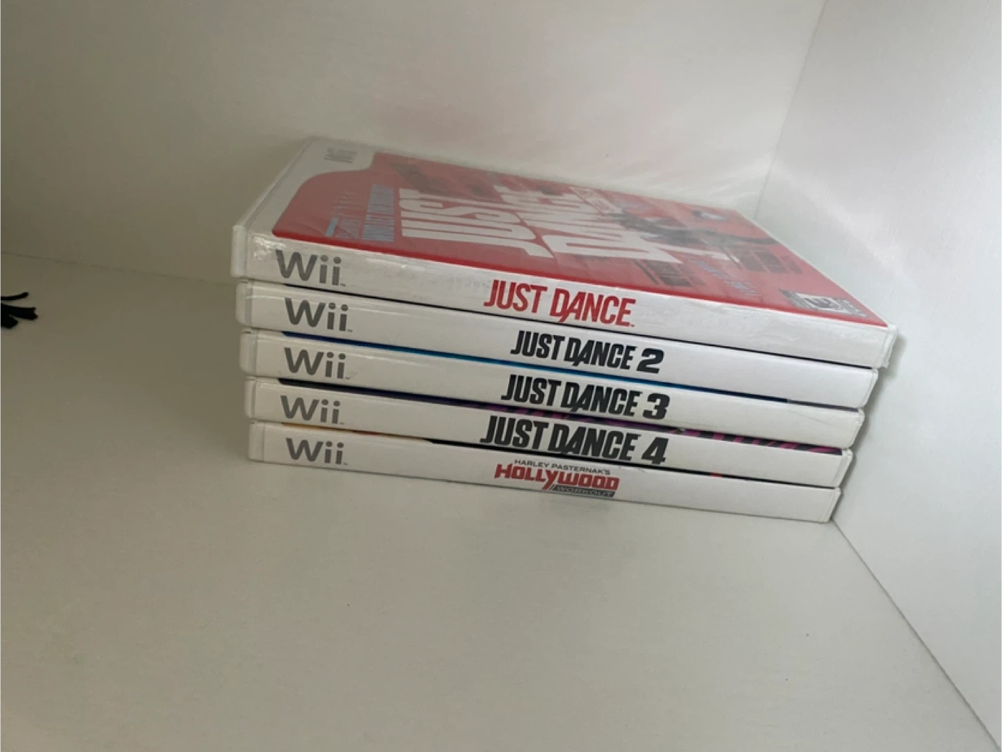 Black Nintendo Wii console with a Wii Remote. Includes games (Just Dance, Just Dance 2, Just Dance 3, Just Dance 4, and Just Dance, Harley Pasternak's Hollywood Party) and relevant cords apart from one HDMI cord - all other wires available