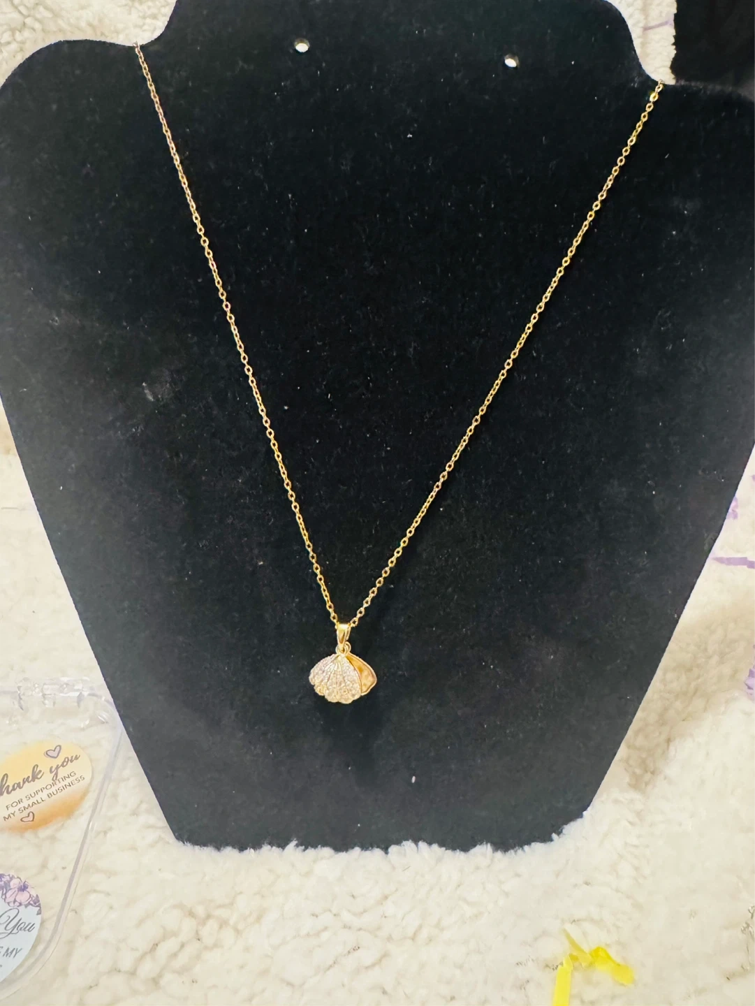 A delicate gold-tone necklace featuring a shell pendant adorned with cubic zirconia and a small pearl. The chain is dainty and adjustable. It's a lovely piece that adds a touch of elegance.