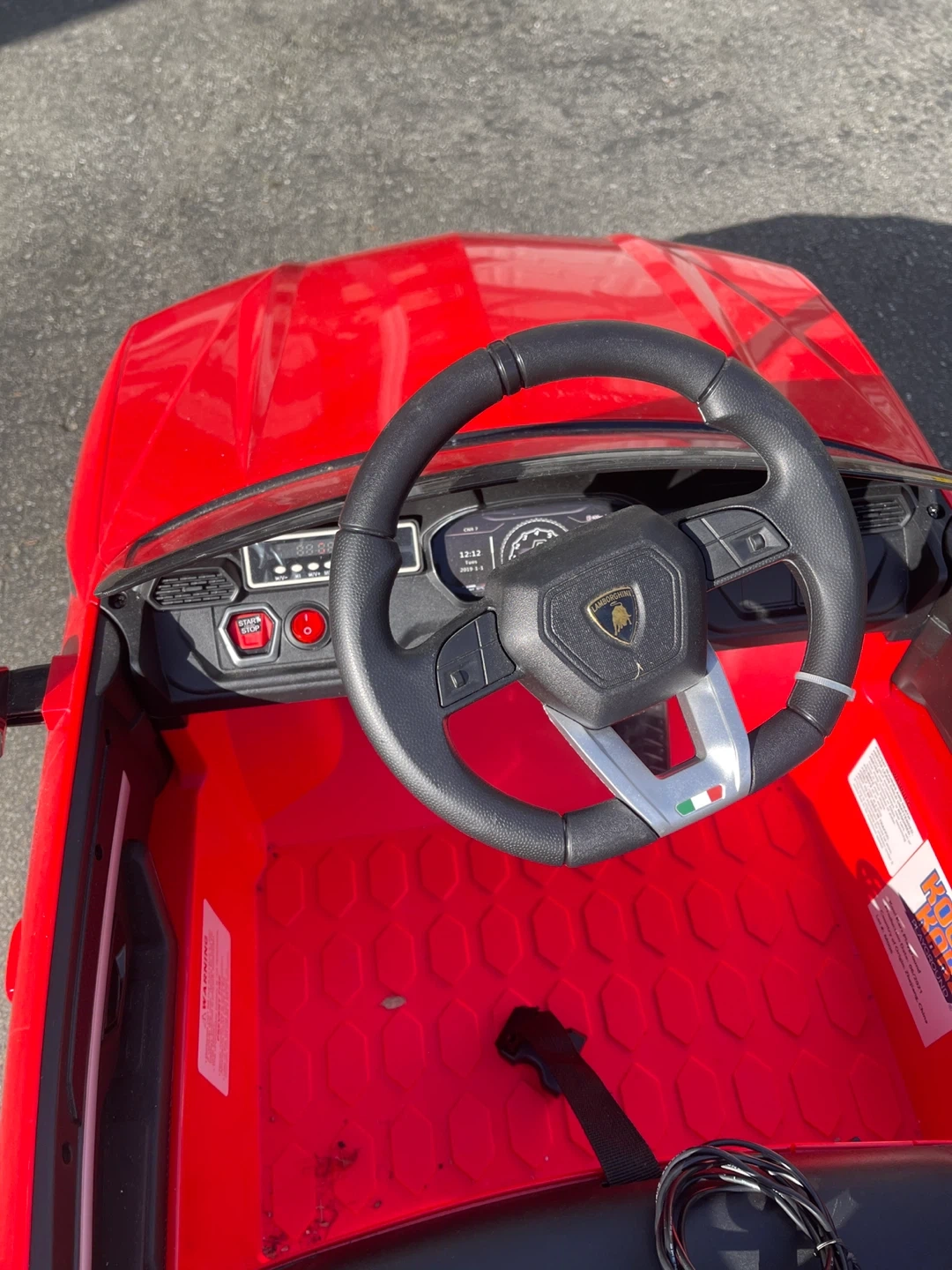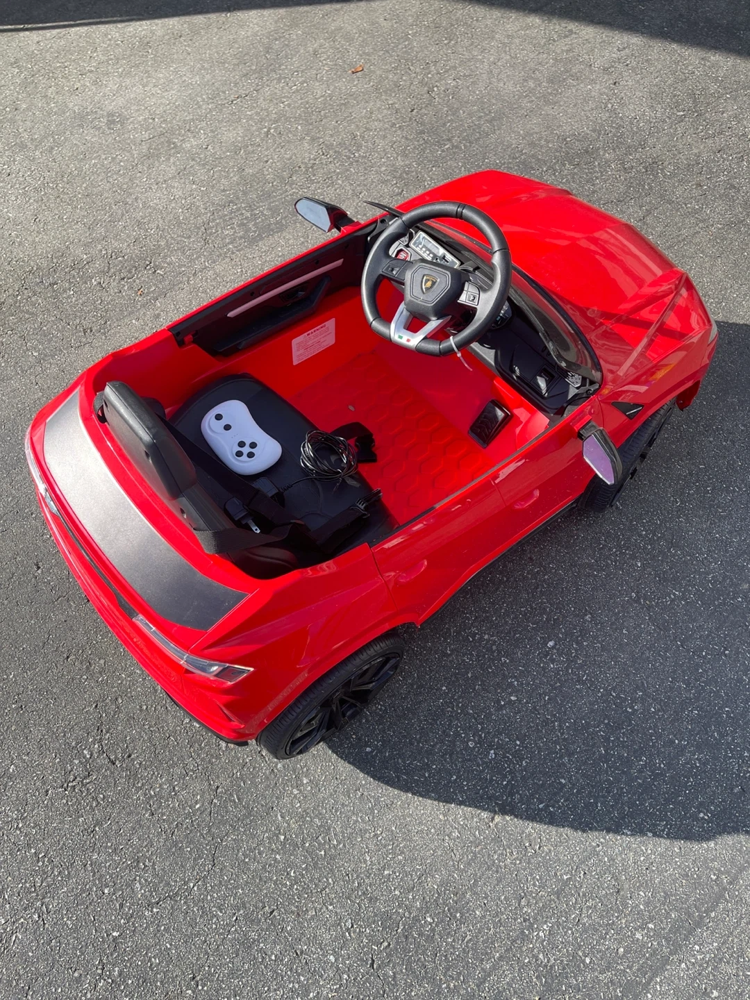 This is a red kids' ride-on electric car, modelled after the Lamborghini Urus. It features a realistic steering wheel and a seat with a safety belt. A remote control is included for parental supervision. This car is powered by electricity for fun outdoor play!
